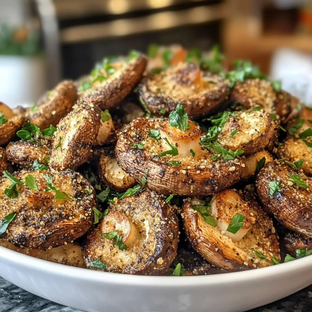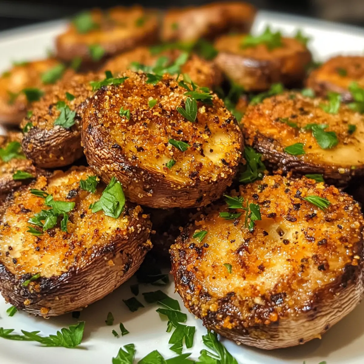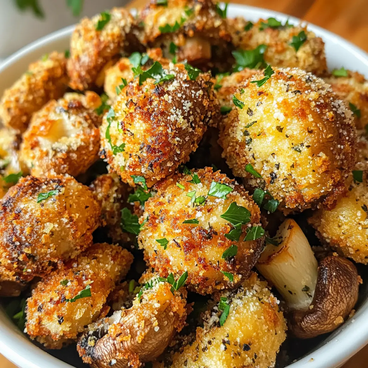Once the cooking time is up, remove the mushrooms from the air fryer and transfer them to a serving plate. To enhance their visual appeal and flavor, sprinkle freshly minced parsley over the top. This final touch not only adds freshness but also invites everyone to dig in right away while they’re still warm and crispy.