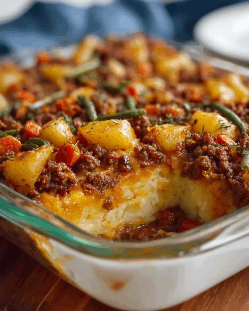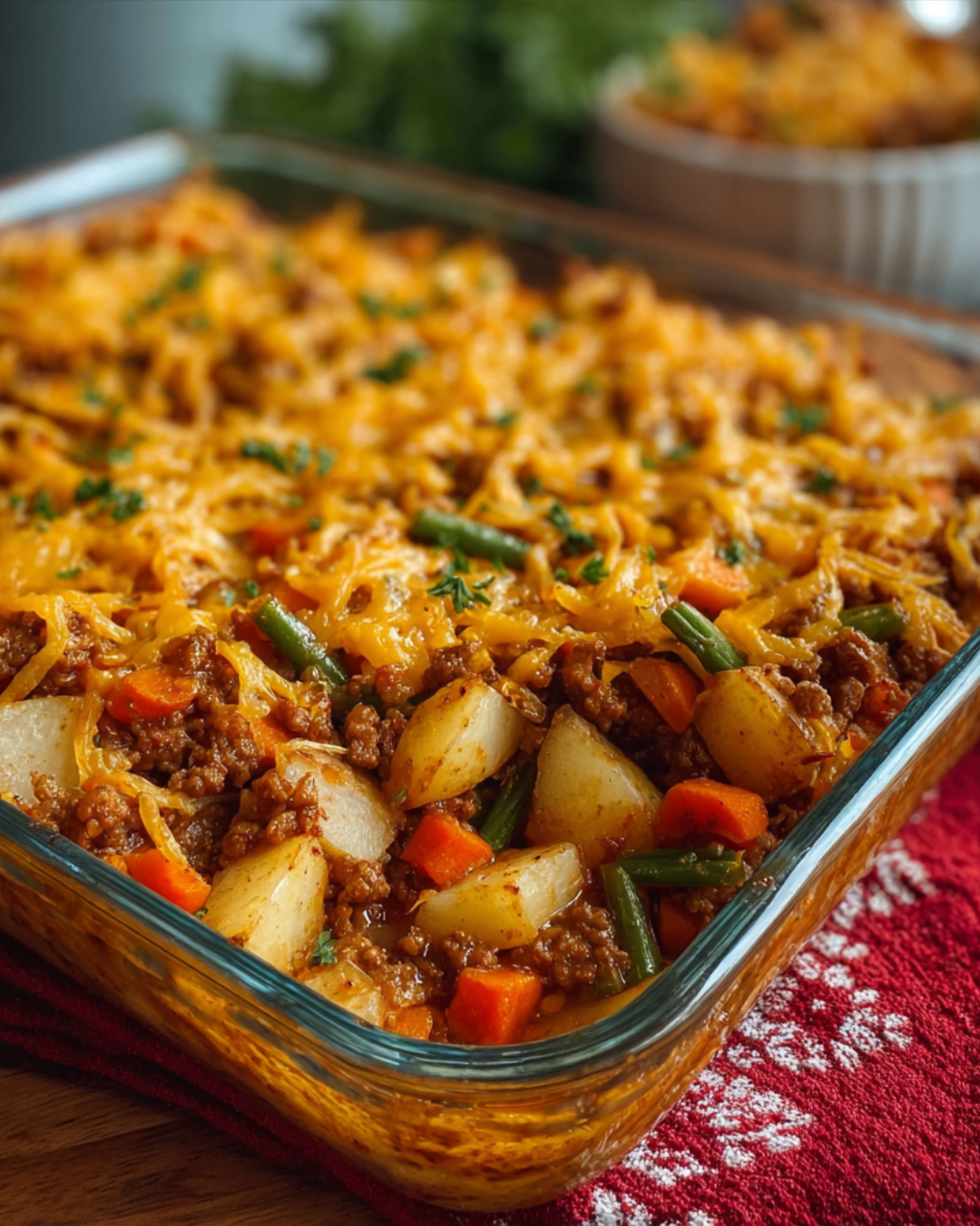 Amish Winter Bliss Casserole is a cozy comfort dish perfect for cold weather, featuring a hearty mix of ground beef, vegetables, and creamy mushroom soup topped with cheese and breadcrumbs.