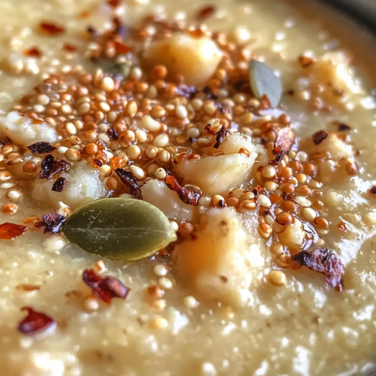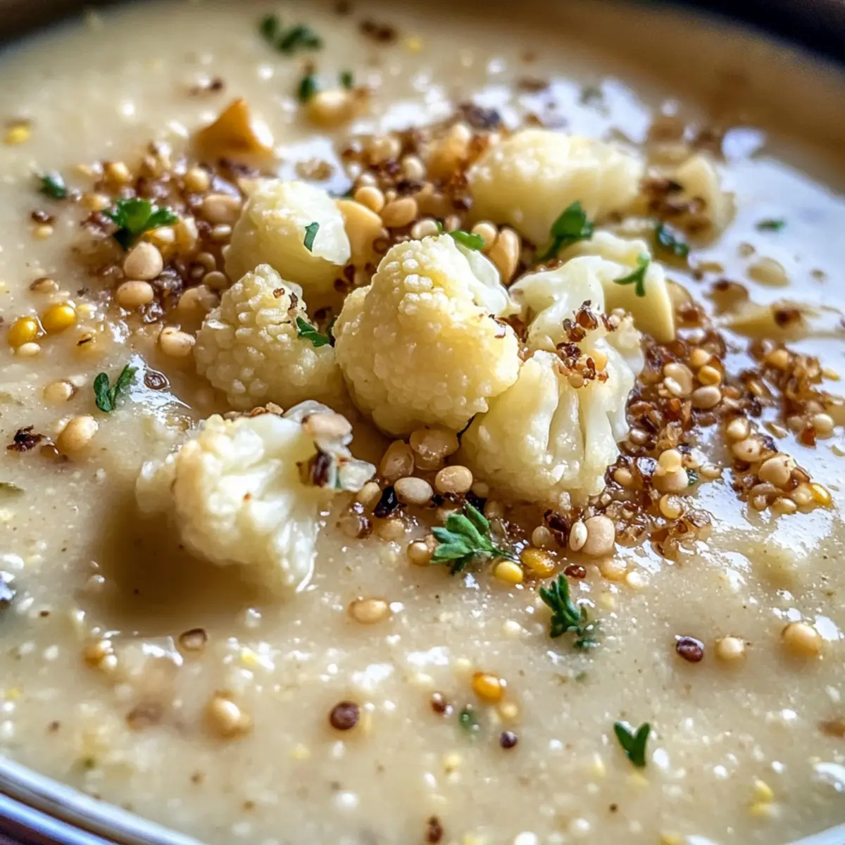 Crunchy Topping: Stir continuously while popping the quinoa to avoid burning. This topping adds a delightful crunch to your Asiago Roasted Garlic Cauliflower Soup.