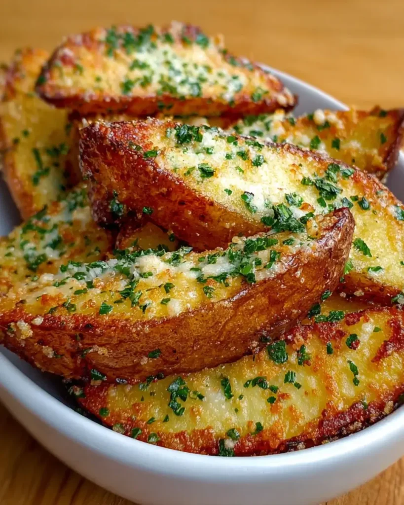 Deliciously crispy baked potato wedges seasoned with garlic and Parmesan cheese.
