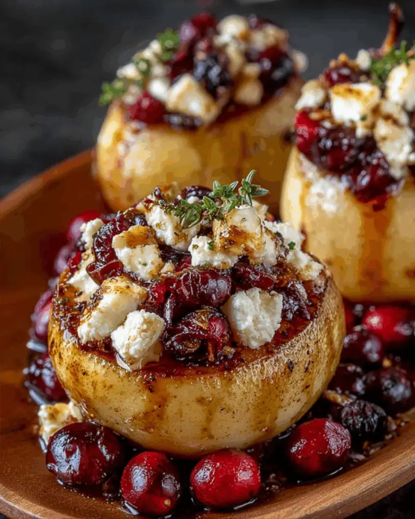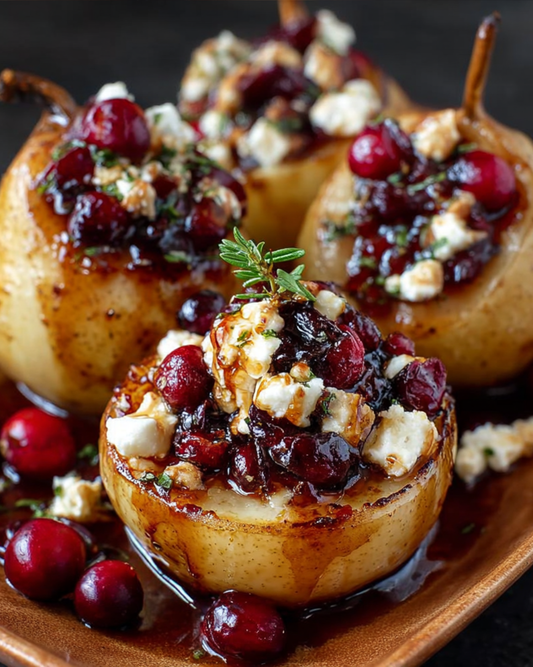 A delightful dessert featuring baked pears stuffed with feta cheese, honey, and cranberries, perfect for a sweet treat.