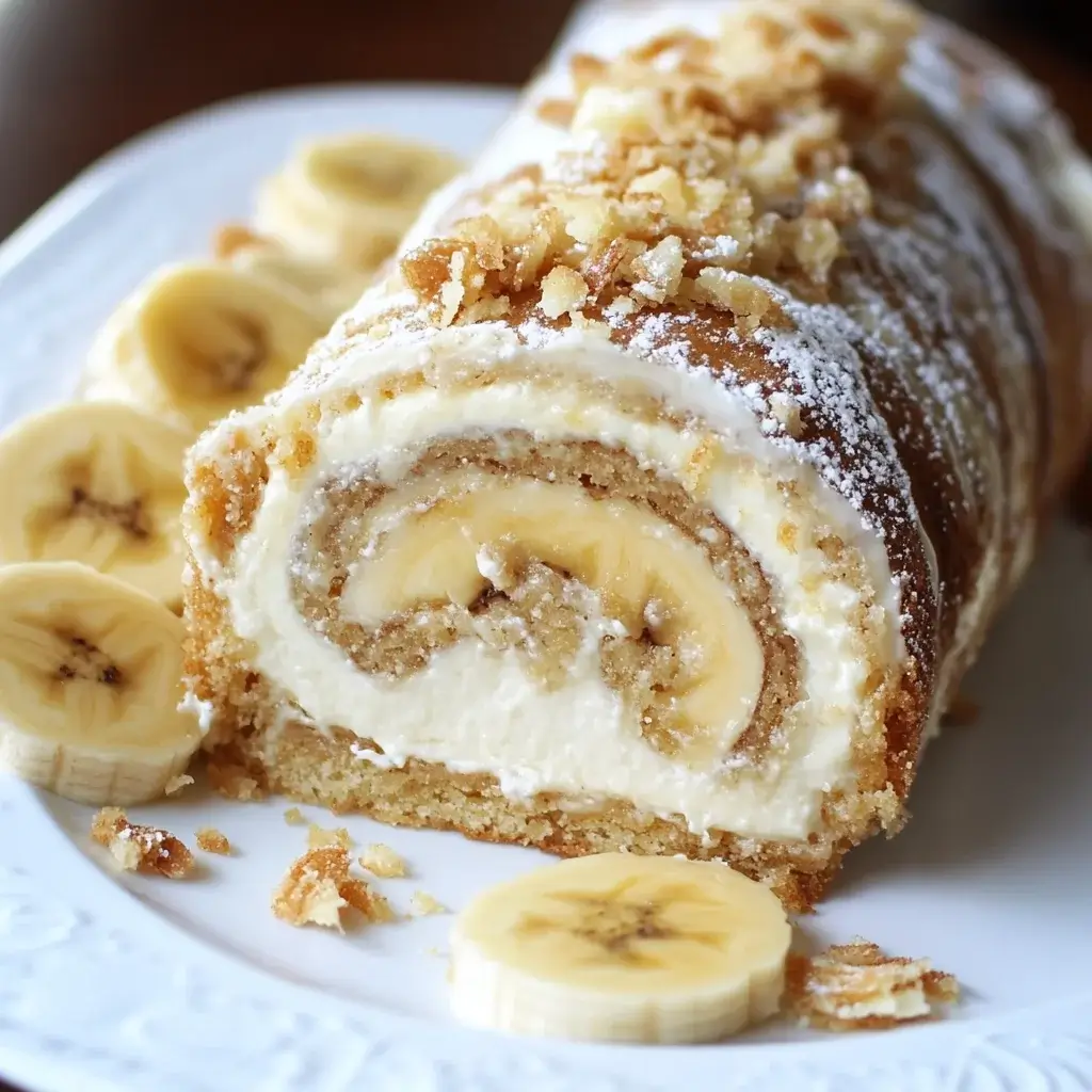 A delightful dessert recipe for a Banana Cream Cheesecake Roll that combines the flavors of banana and cheesecake in a rolled cake.