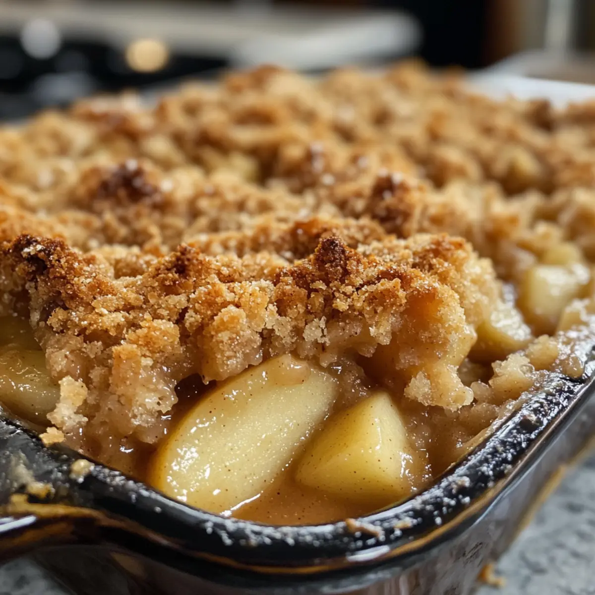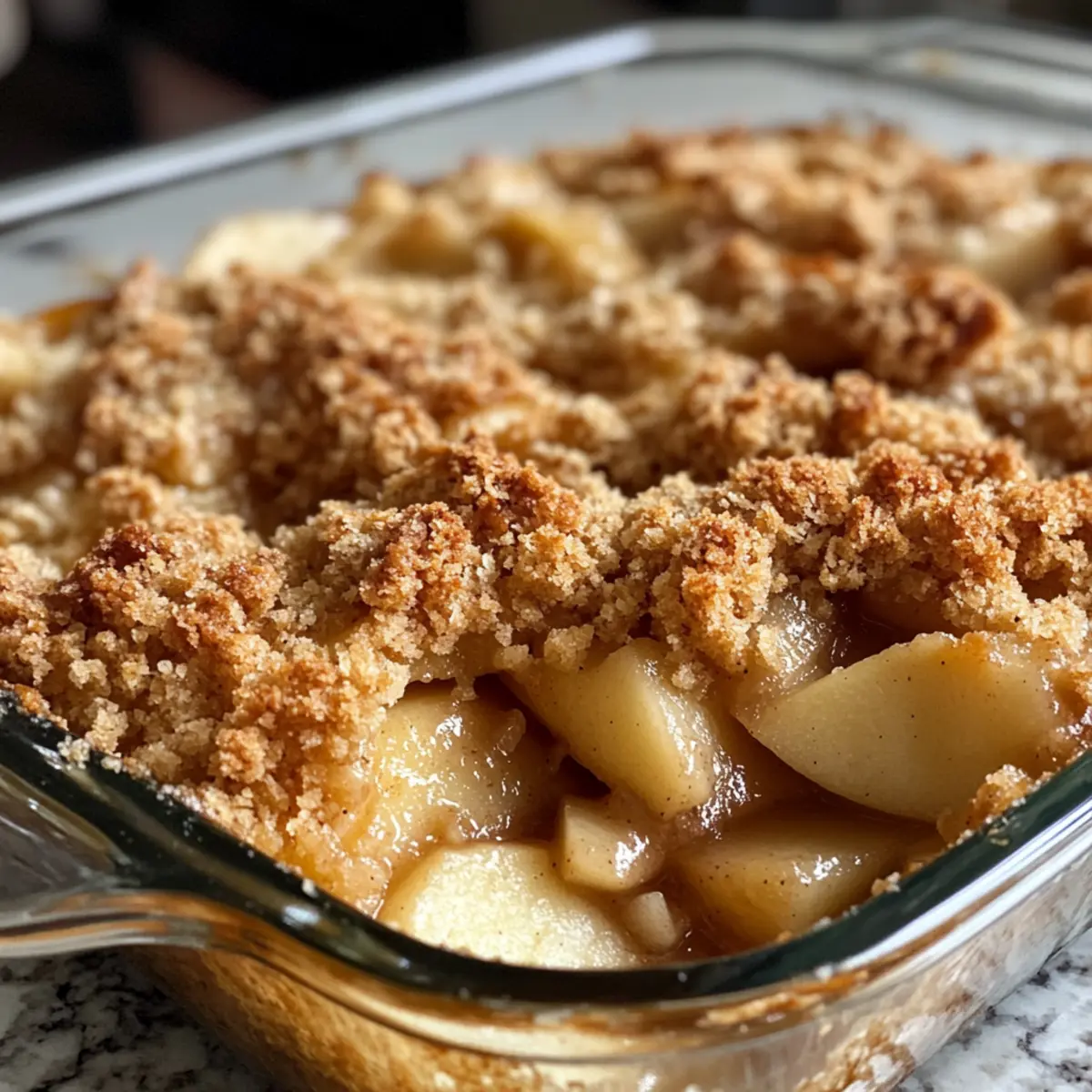- Sprinkle the crumble mixture evenly over the apple layer.