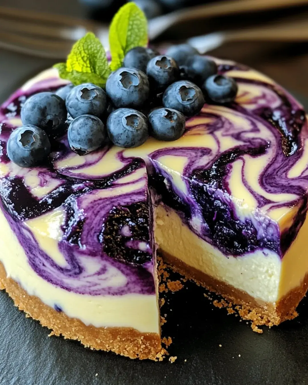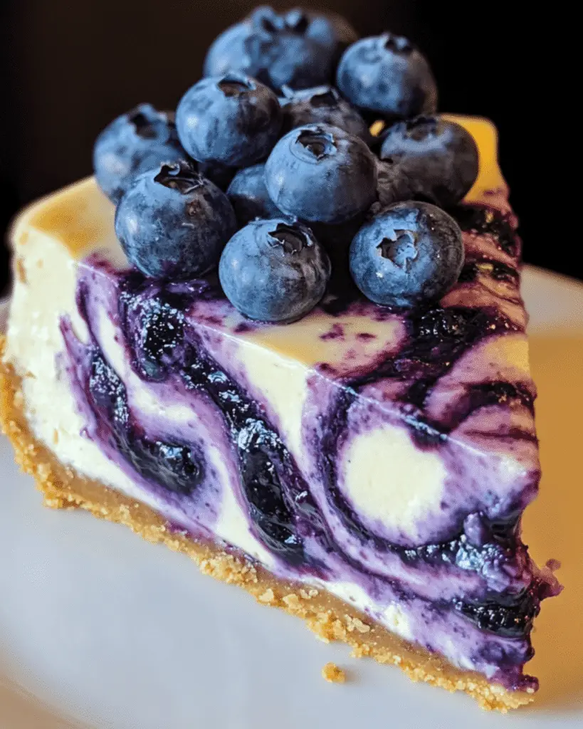 A creamy and delicious blueberry swirl cheesecake that combines the richness of cream cheese with the sweetness of blueberries.
