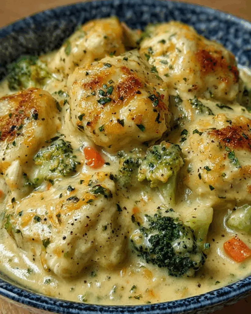With tender chicken, vibrant broccoli, and fluffy dumplings all swimming in a creamy cheddar sauce, it’s a meal that not only satisfies but also brings everyone together around the table.