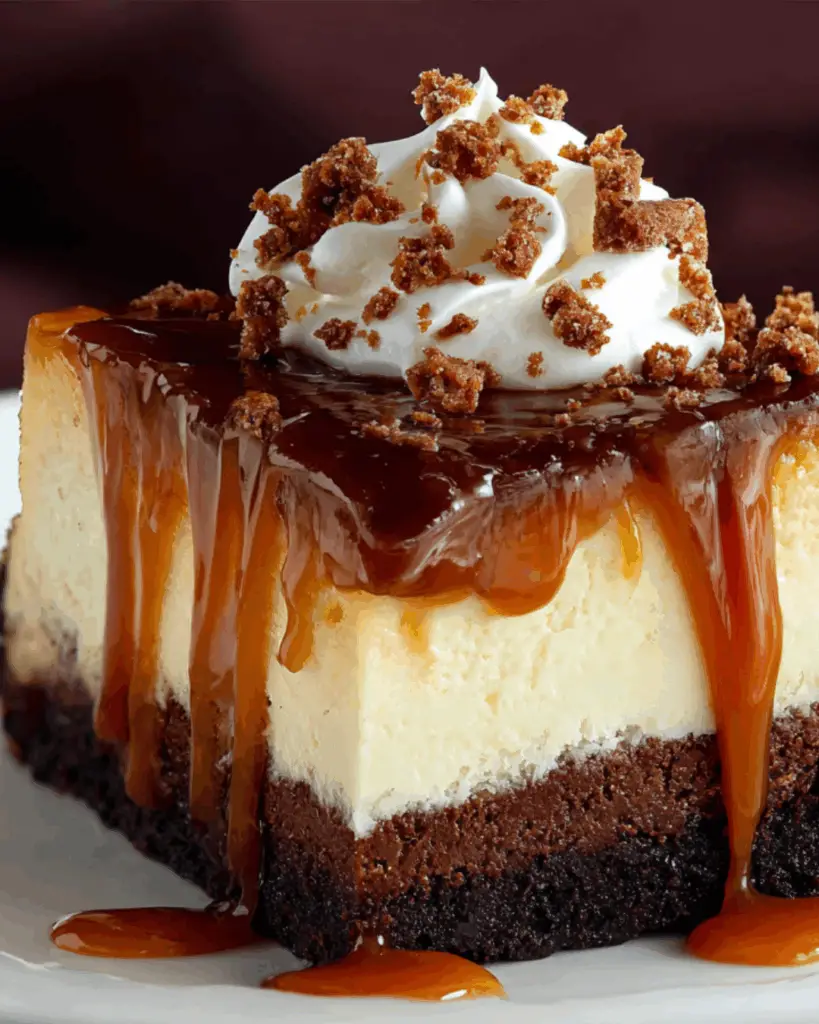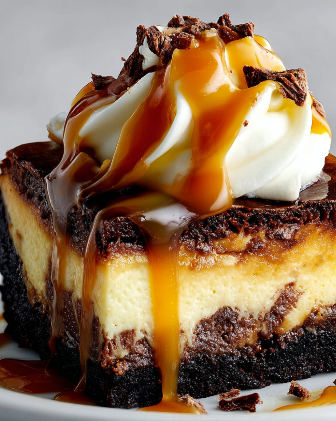 A rich and indulgent dessert combining layers of brownie, creamy cheesecake, and luscious caramel.