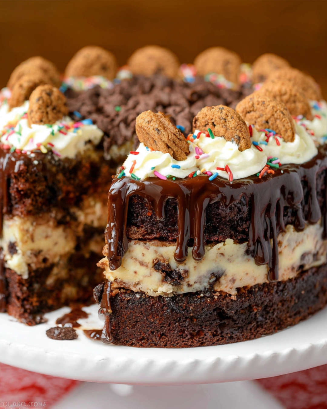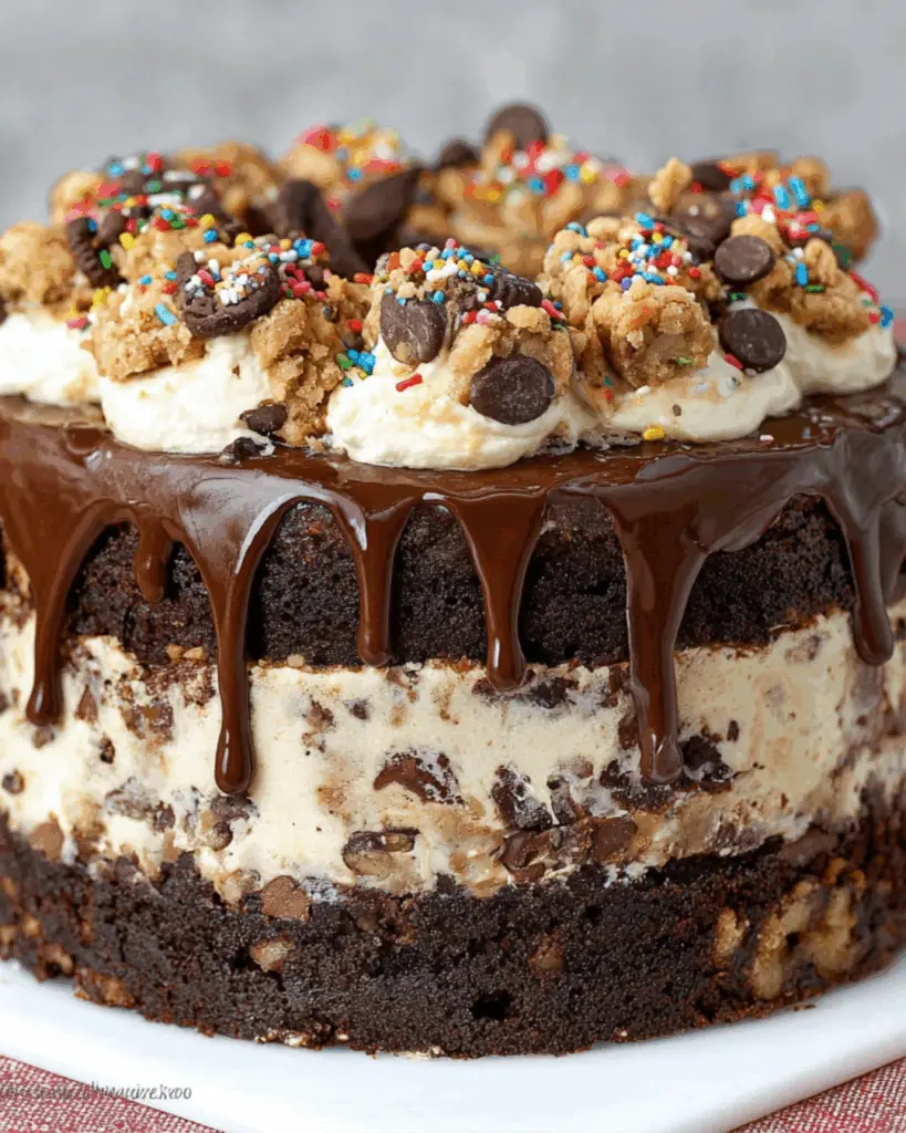 A decadent Brownie Cookie Dough Cake that combines rich brownie layers with delicious cookie dough frosting.