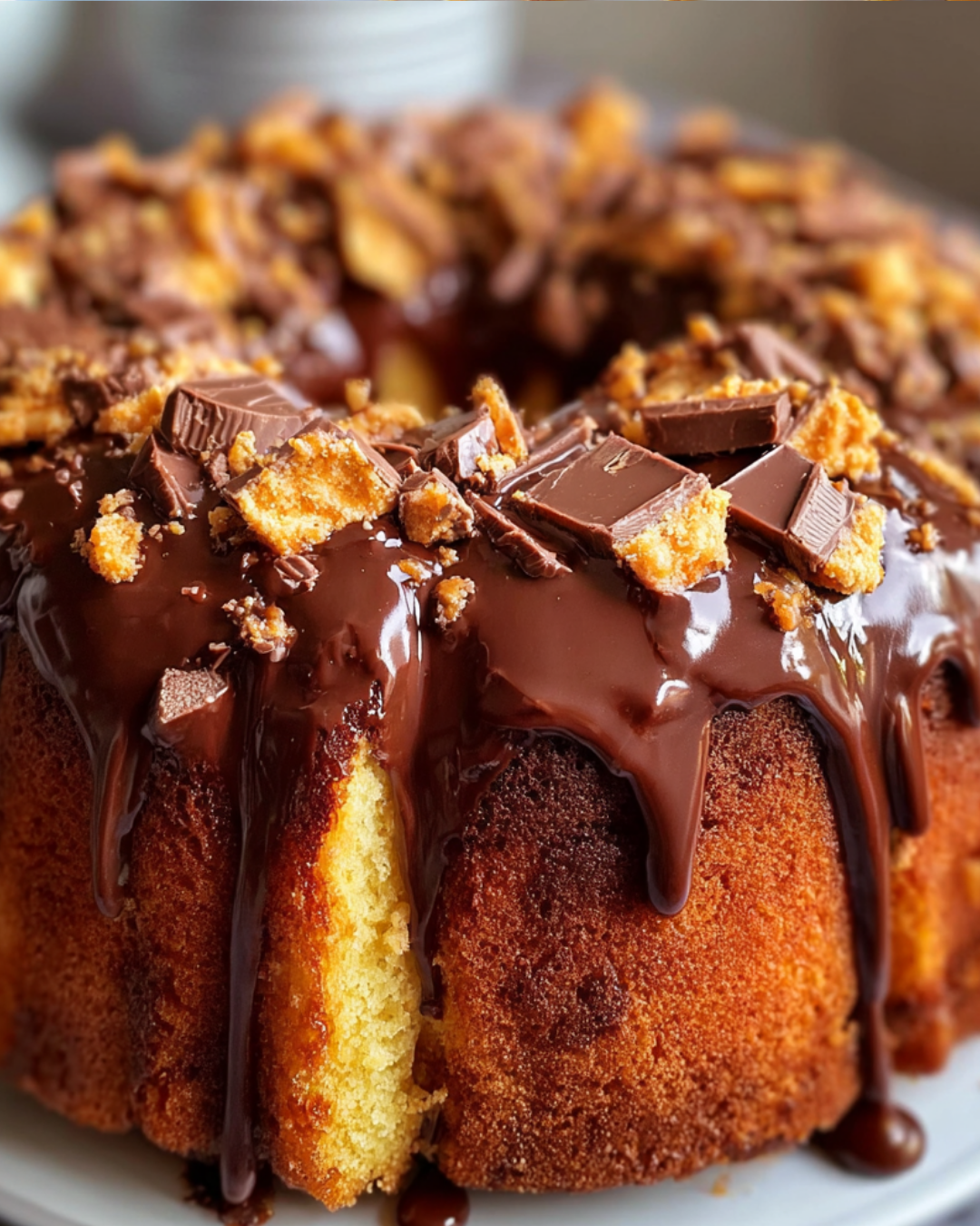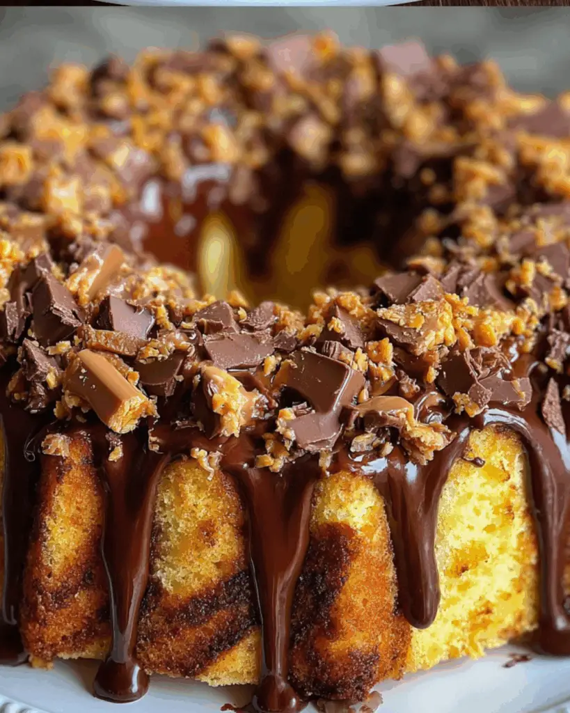 A delicious Butterfinger Bundt Cake topped with a rich chocolate drizzle, perfect for any occasion.