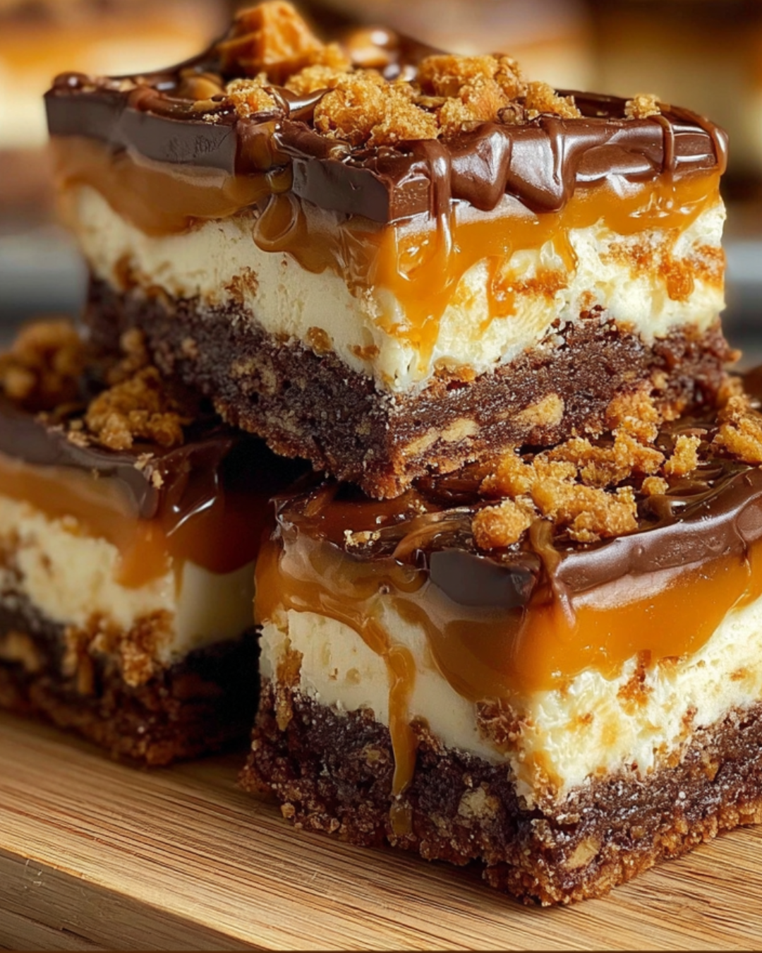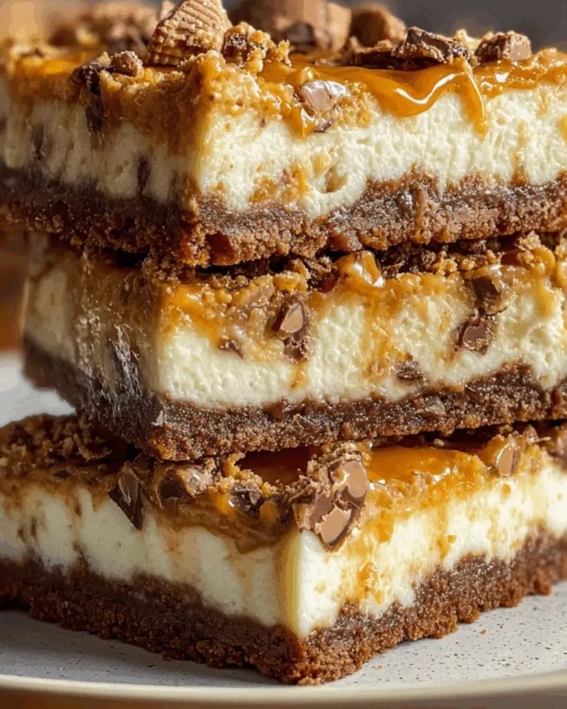Delicious Butterfinger Caramel Cheesecake Bars that combine creamy cheesecake with a buttery graham cracker crust and a rich caramel topping.