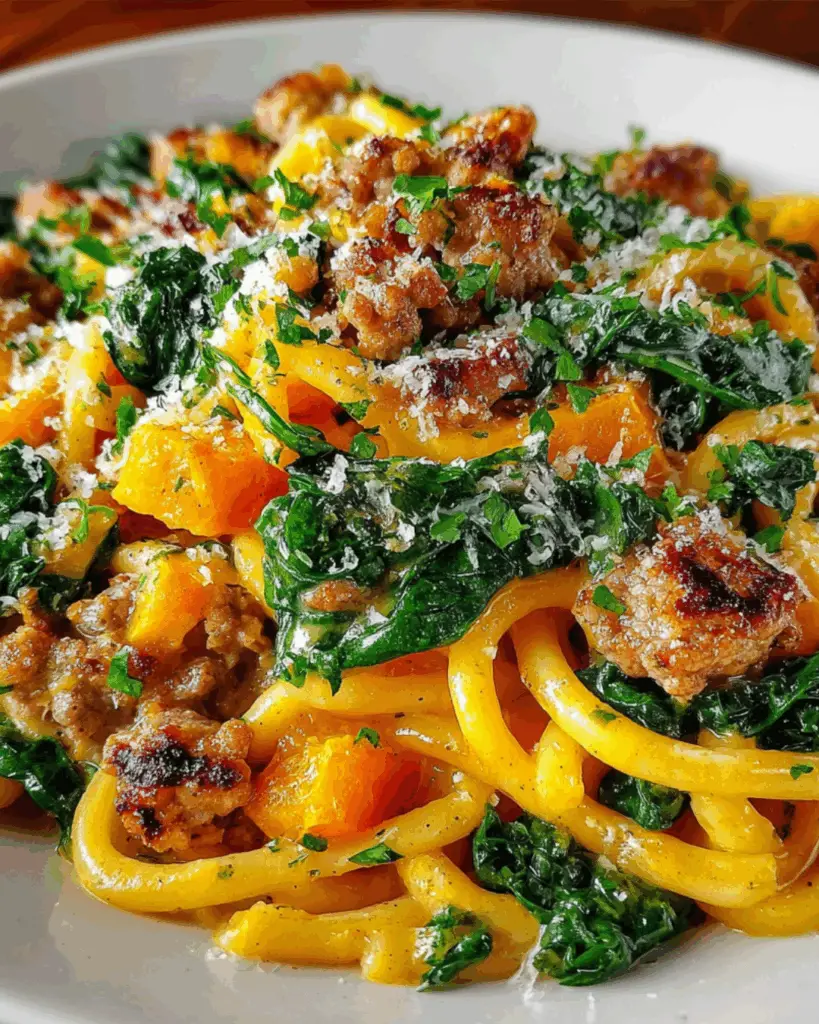 Enjoy your Butternut Squash Pasta with Sausage and Spinach, a dish that’s sure to impress!