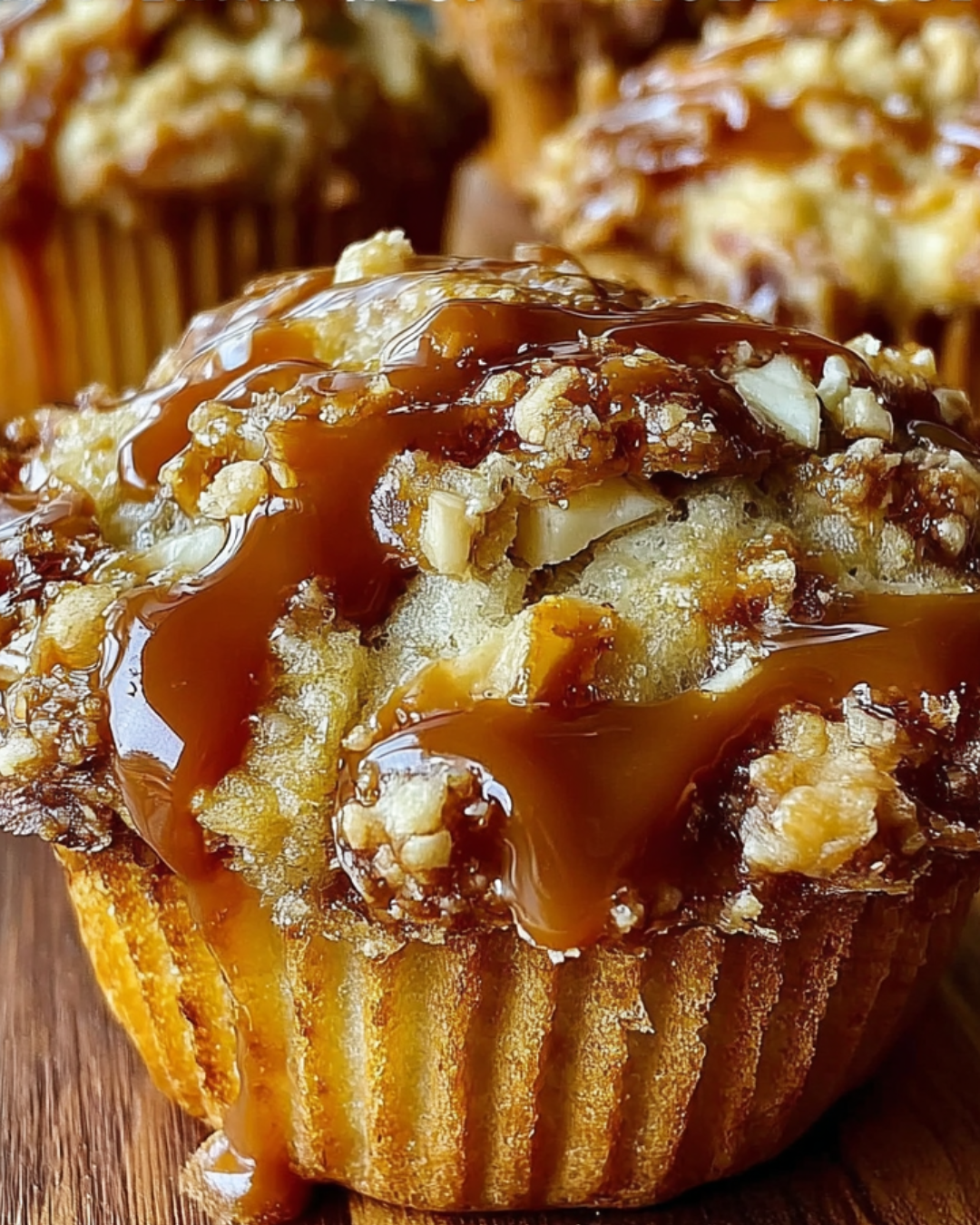 Deliciously moist muffins filled with diced apples and drizzled with caramel sauce, perfect for a sweet treat.
