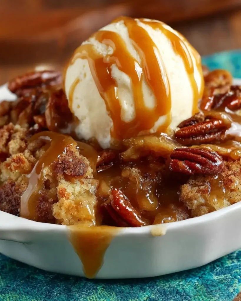 A delicious dessert combining caramel, apples, and pecans in a warm cobbler.