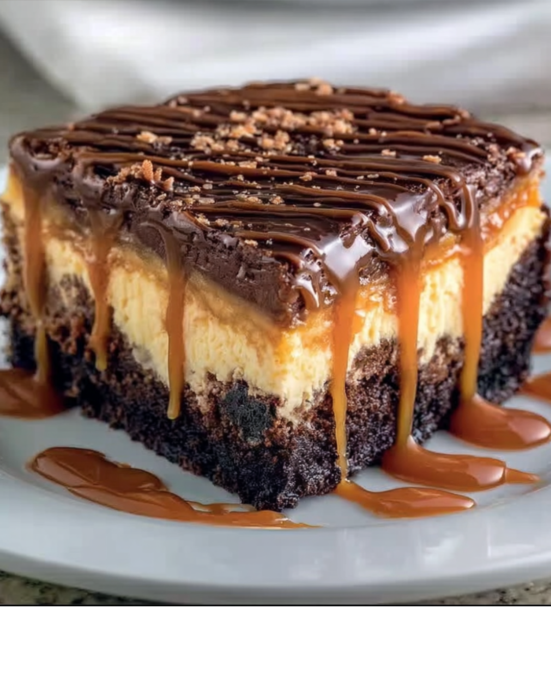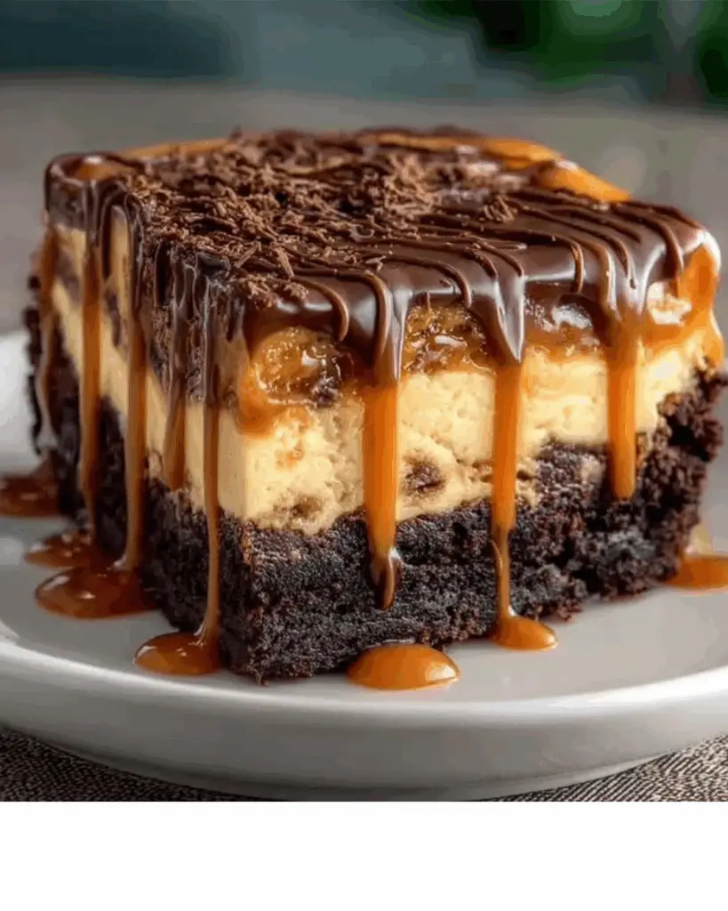 The combination of textures—rich brownie, creamy cheesecake, and gooey caramel—creates a symphony of flavors that dance on your palate.