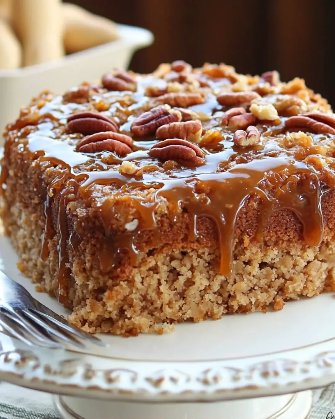 A delicious and moist Caramel Coconut Pecan Oatmeal Cake topped with rich caramel sauce, perfect for any occasion.
