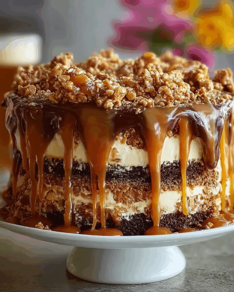 A deliciously indulgent Caramel Toffee Crunch Cake that combines rich chocolate flavors with a sweet caramel sauce and crunchy toffee bits.