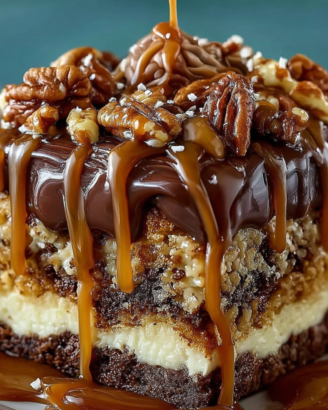 A delicious dessert delight featuring a moist chocolate cake soaked in caramel and chocolate syrup, topped with whipped cream and pecans.
