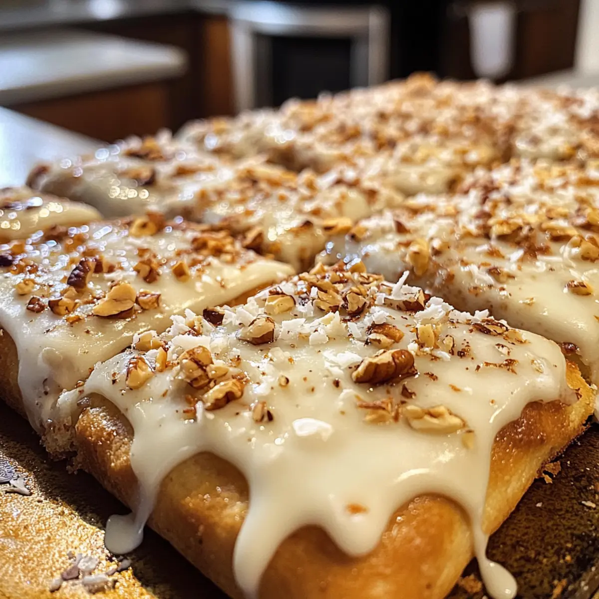 As soon as your focaccia is out of the oven, prepare the cream cheese glaze. In a mixing bowl, combine 4 ounces of softened cream cheese, 1 cup of powdered sugar, and a splash of milk until smooth. Drizzle the glaze generously over the warm Carrot Cake Sourdough Focaccia Bread, then sprinkle with toasted coconut and chopped pecans if desired for that extra flair.