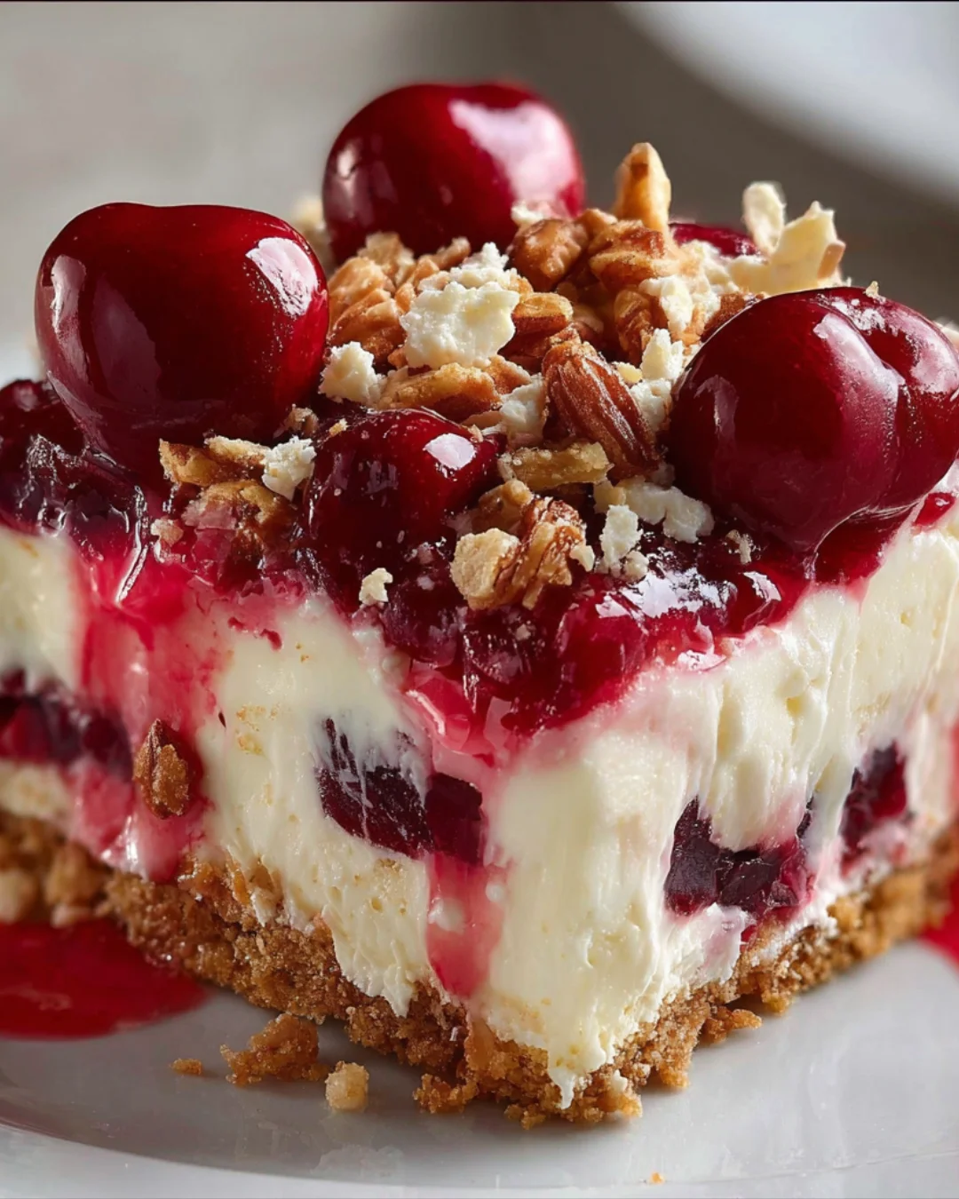 This delightful no-bake treat combines creamy cheesecake goodness with a sweet cherry topping, all resting on a buttery graham cracker crust.