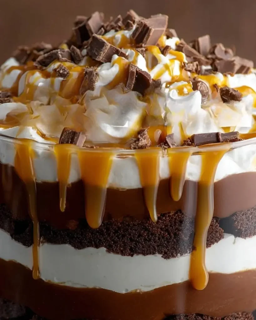 A decadent dessert featuring layers of brownie bites, chocolate pudding, caramel sauce, and whipped cream, topped with chocolate chips and nuts.