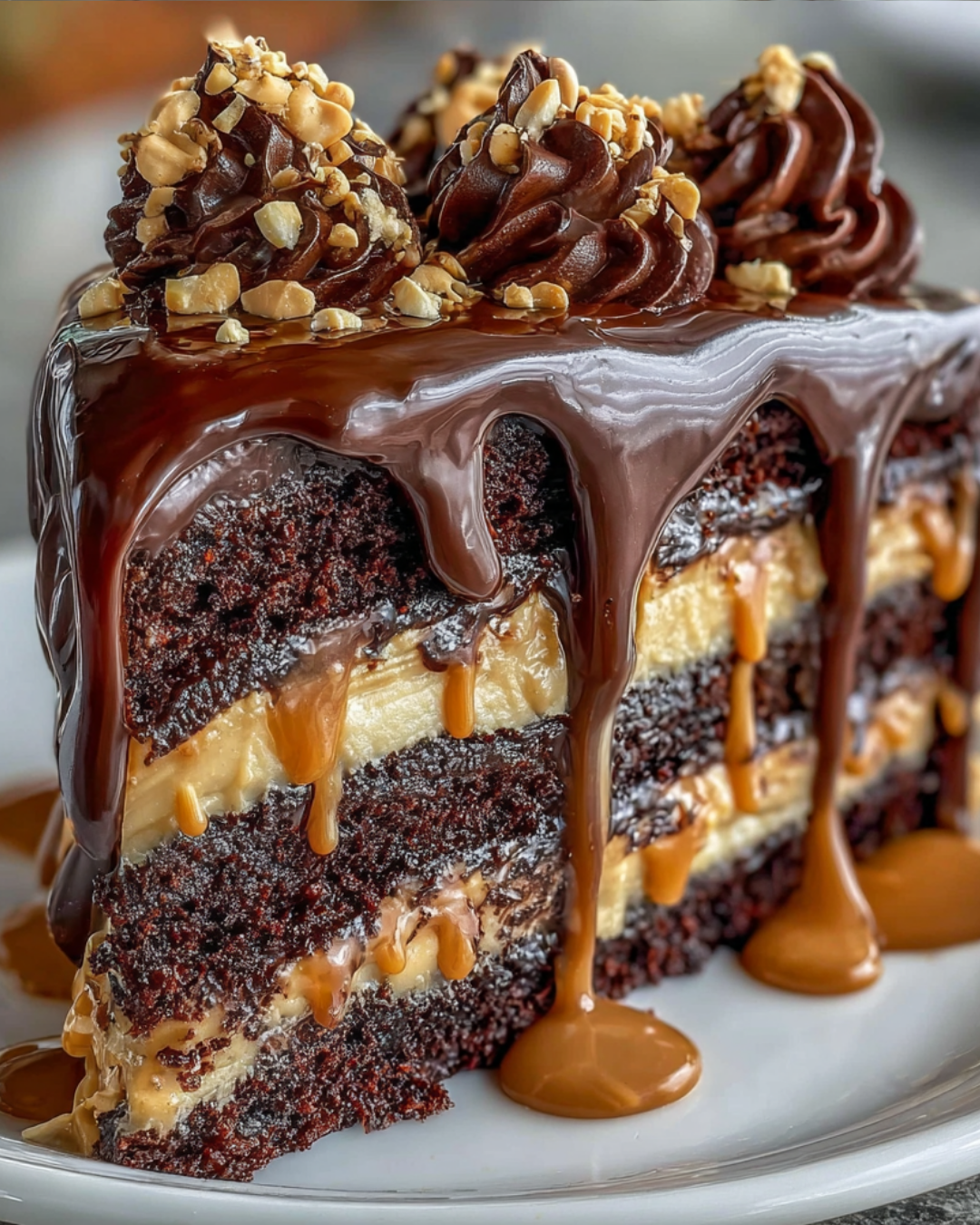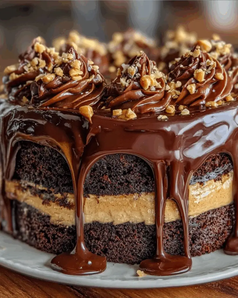 A decadent Chocolate Peanut Butter Layer Cake with rich chocolate ganache, perfect for any dessert lover.