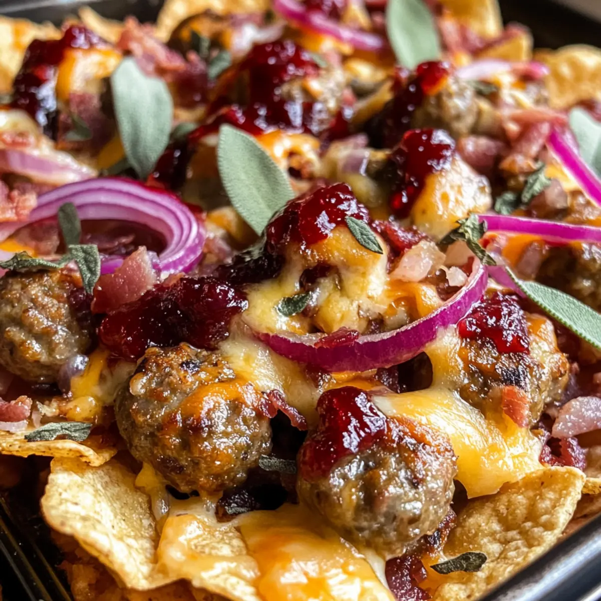 The sizzling sound of sizzling sausage meatballs fills the kitchen, instantly transporting me to my favorite festive gatherings. It’s that magical time of year when we gather around the table, and nothing brings people together quite like the Ultimate Christmas Nachos with Sausages and Bacon Bliss. These scrumptious nachos offer a delightful blend of crispy tortilla chips, hearty sausage, and savory bacon, all drizzled with a sweet and tangy cranberry sauce. Not only are they an absolute crowd-pleaser, but they’re also easy to whip up in just 30 minutes! Perfect for those busy holiday nights or casual gatherings, this recipe has the versatile charm to adapt for everyone—even those seeking vegan alternatives. Curious about how to create this festive experience in your own kitchen? Let’s dive into the delicious details!