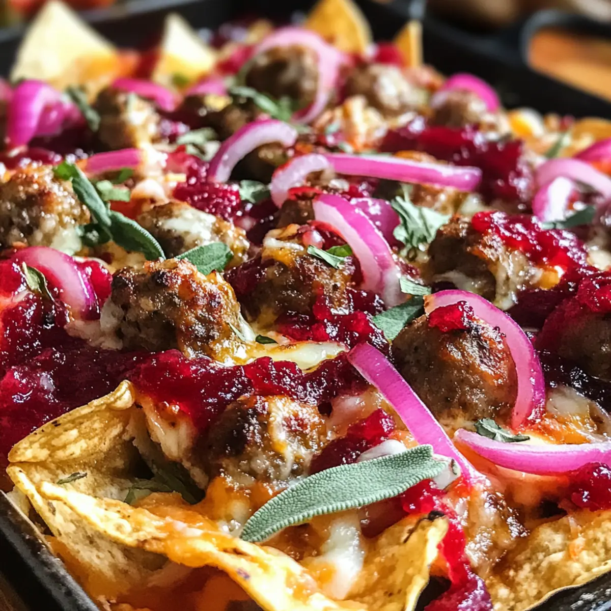 These Ultimate Christmas Nachos with Sausages and Bacon Bliss are perfect for meal prepping, allowing you to enjoy flavorful nachos with minimal last-minute effort! You can prepare the sausage meatballs and crumbled bacon up to 3 days in advance and store them in an airtight container in the refrigerator. Additionally, you can mix the red onion, lime juice, sugar, and salt to enhance the flavors—this can sit in the fridge overnight for a zesty topping. When you’re ready to serve, layer the chips, sausage meatballs, cooked chicken, cranberry sauce, and cheese, then bake as directed. This way, you’ll have a delicious dish ready to impress with just a little effort!