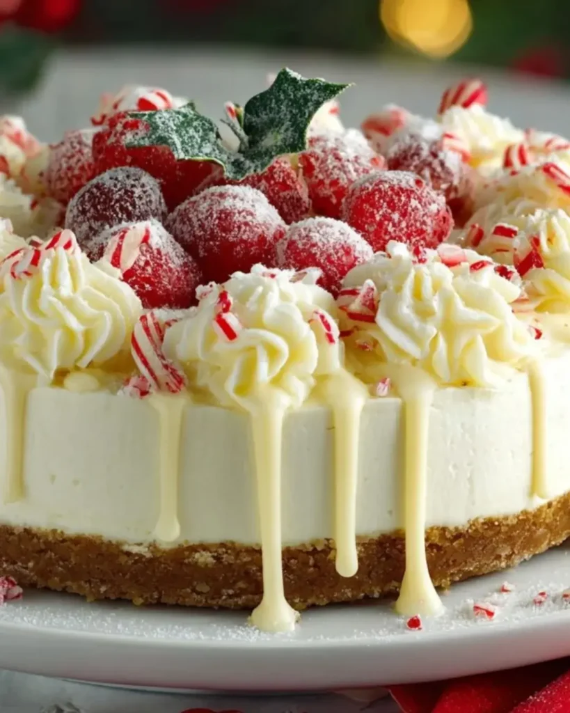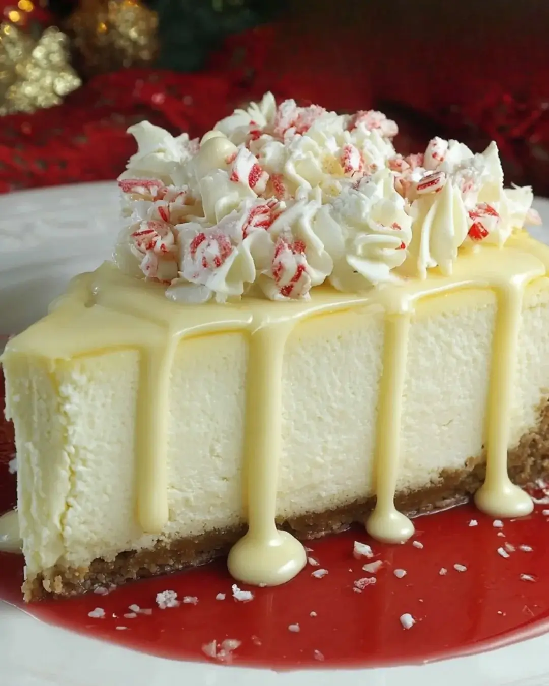 A delightful Christmas White Chocolate Cheesecake that combines creamy white chocolate with a hint of peppermint, perfect for holiday celebrations.