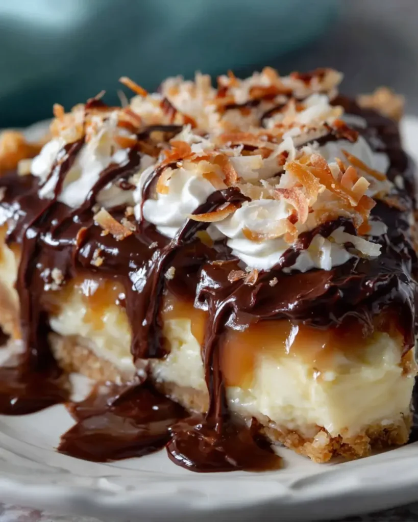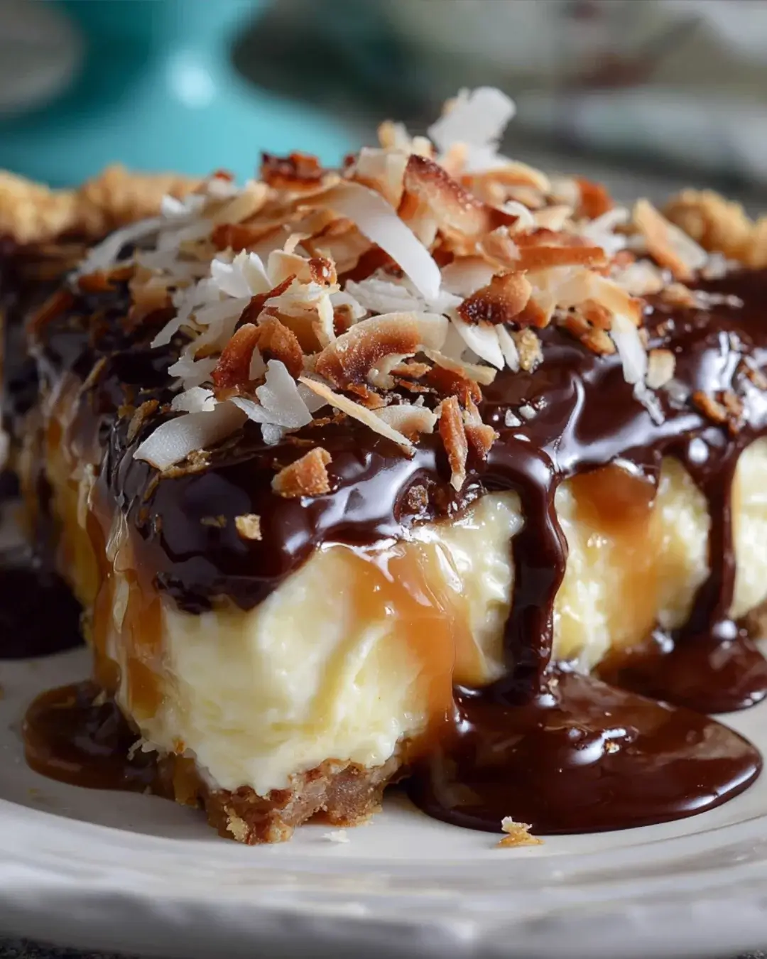 Each layer tells a story, from the rich chocolate crust to the creamy coconut topping.