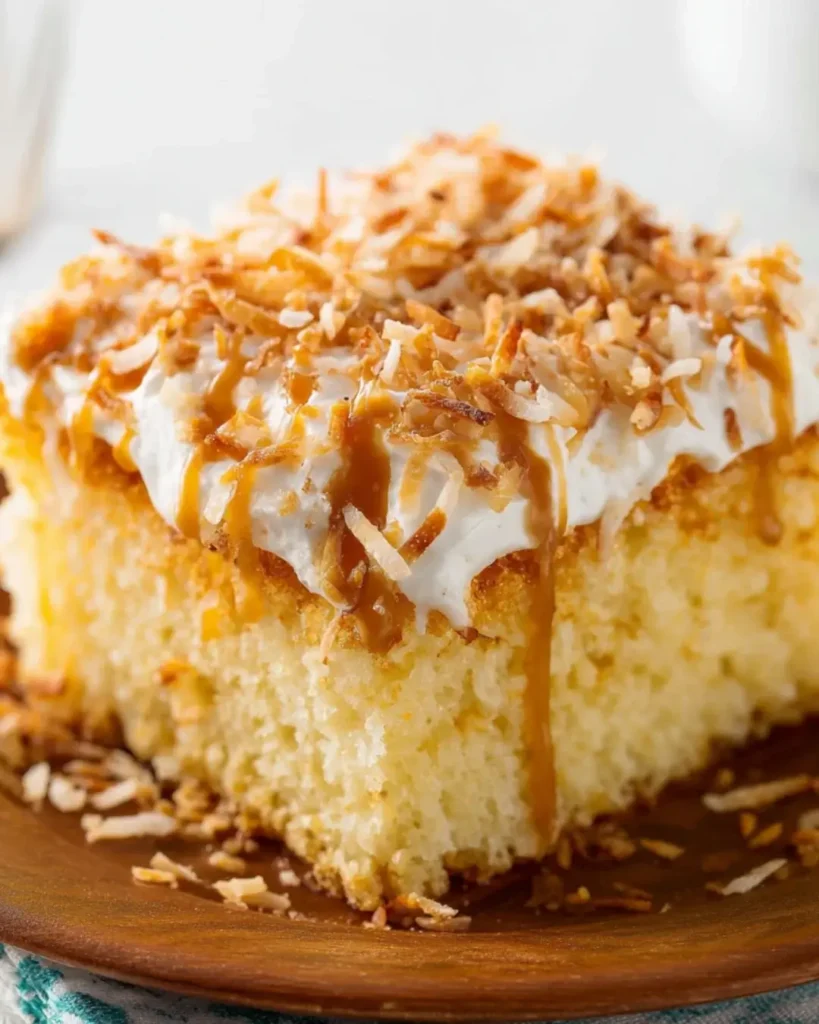 Coconut Caramel Poke Cake is a delicious dessert that combines the flavors of coconut and caramel in a moist cake, topped with whipped cream and toasted coconut flakes.