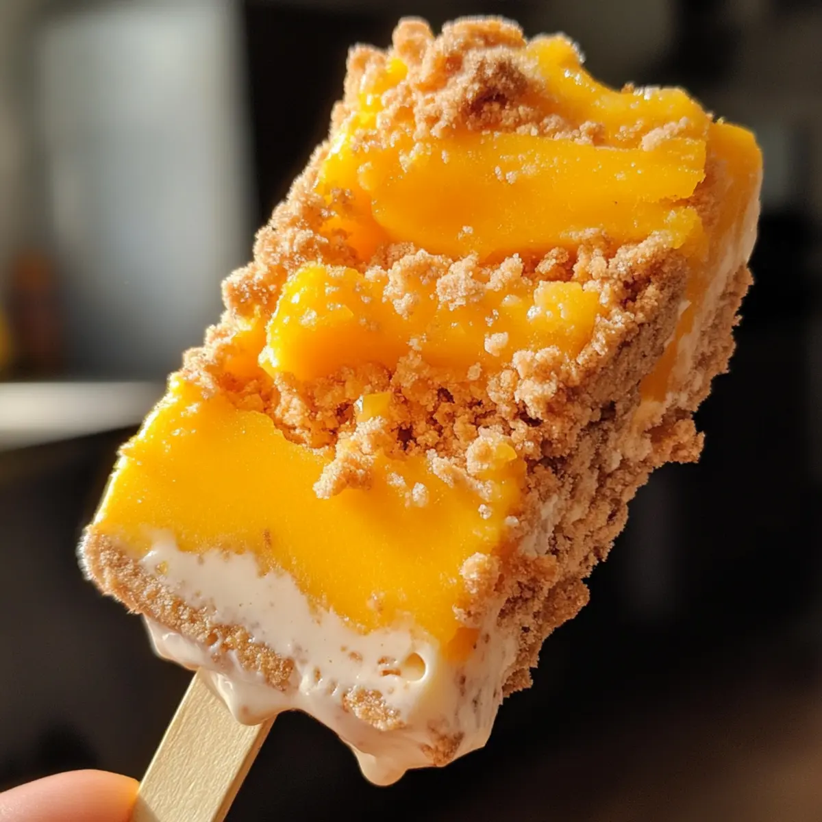 Once the mango bars are frozen solid, carefully remove them from the molds by gently pulling on the sticks. Dip each bar into the honey yogurt mixture, fully coating the sides, and then roll them in the cookie mixture to achieve a crunchy exterior. This method gives your bars a lovely, sweet, and crispy finish.