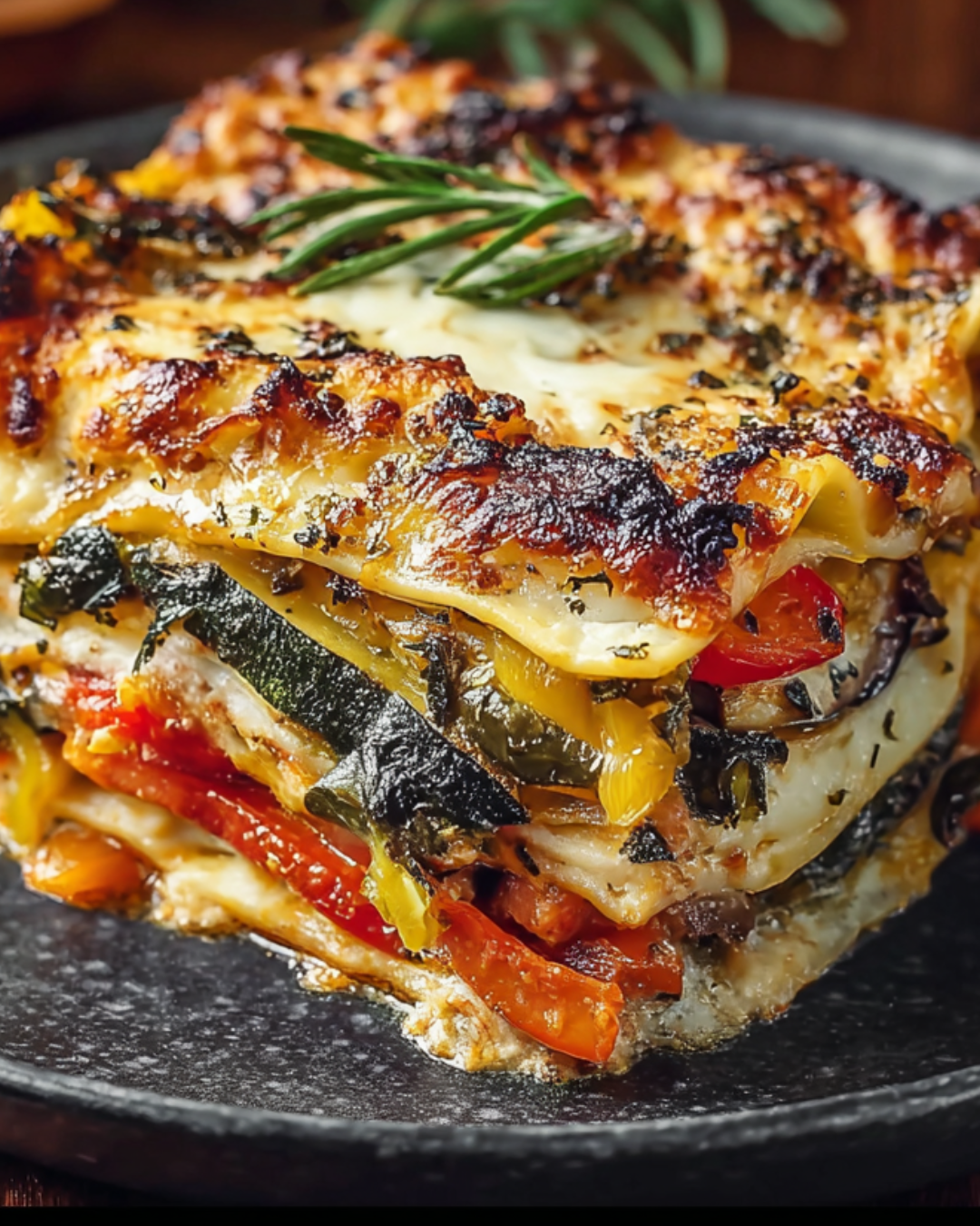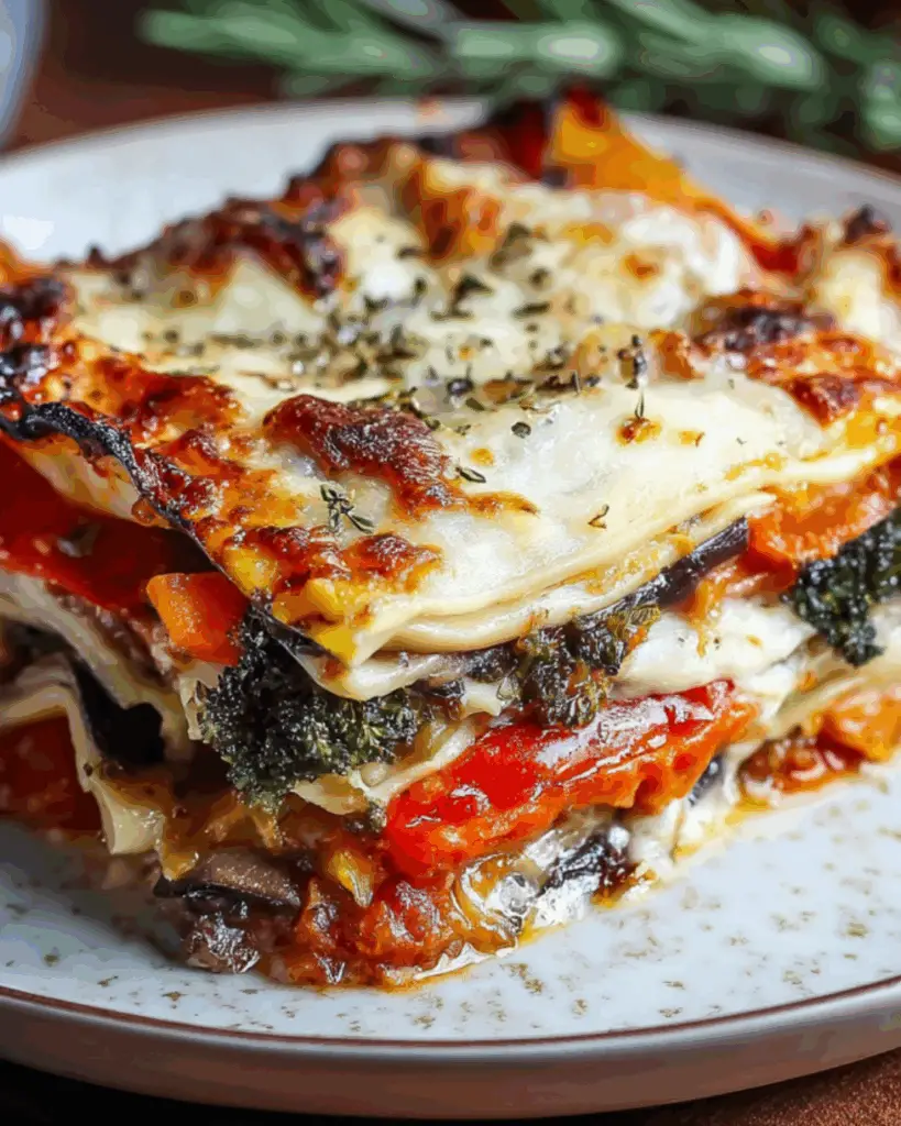 A comforting and delicious lasagna filled with roasted vegetables, perfect for a cozy meal.