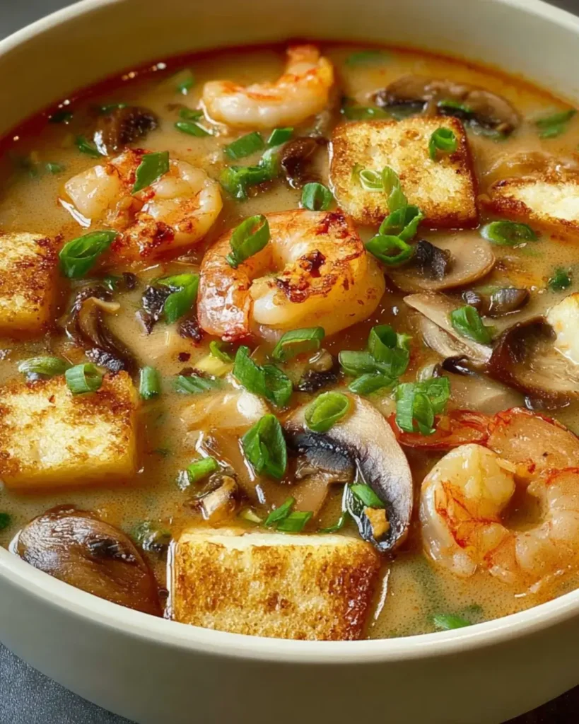 A rich and flavorful creamy soup made with shrimp and mushrooms, perfect for a comforting meal.