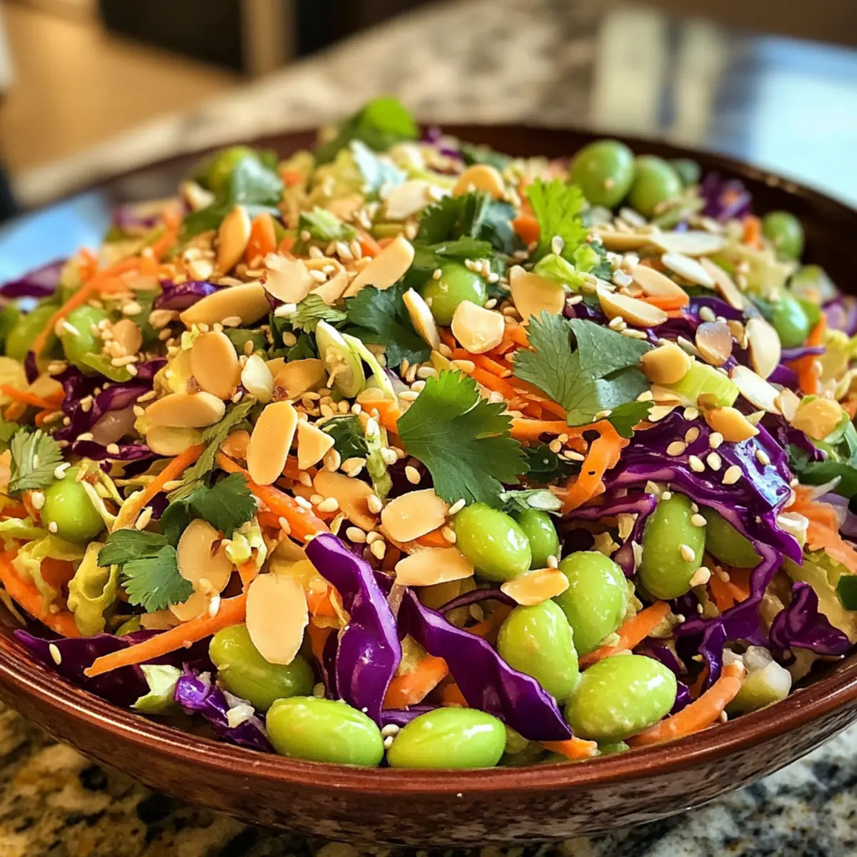 Before serving, give the salad a final gentle toss. If desired, garnish with extra cilantro or toasted almonds for added visual appeal and crunch. Serve chilled or at room temperature as a refreshing side dish or a light lunch, inviting everyone to enjoy the delightful combination of textures in your Crunchy Cabbage and Edamame Salad with Sesame Ginger Dressing.