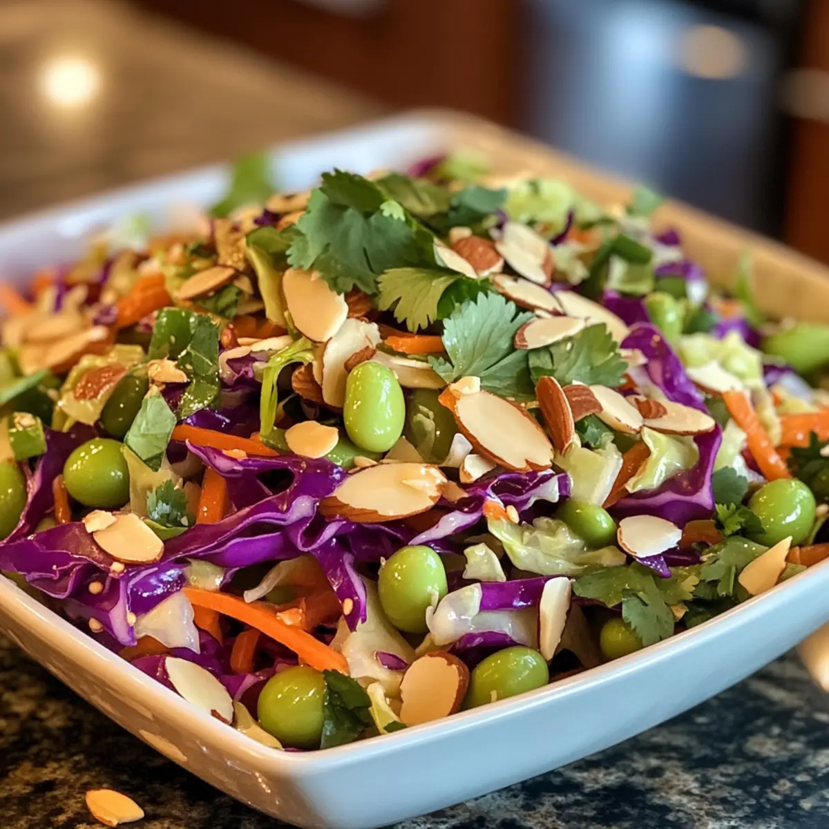 - In a large mixing bowl, combine 2 cups of shredded green cabbage, 1 cup of shredded red cabbage, 1 cup of shelled edamame, 1 cup of shredded carrots, 1/4 cup of sliced green onions, 1/4 cup of chopped cilantro, and 1/4 cup of toasted sliced almonds. Toss gently to mix.