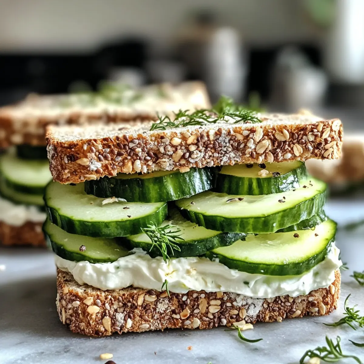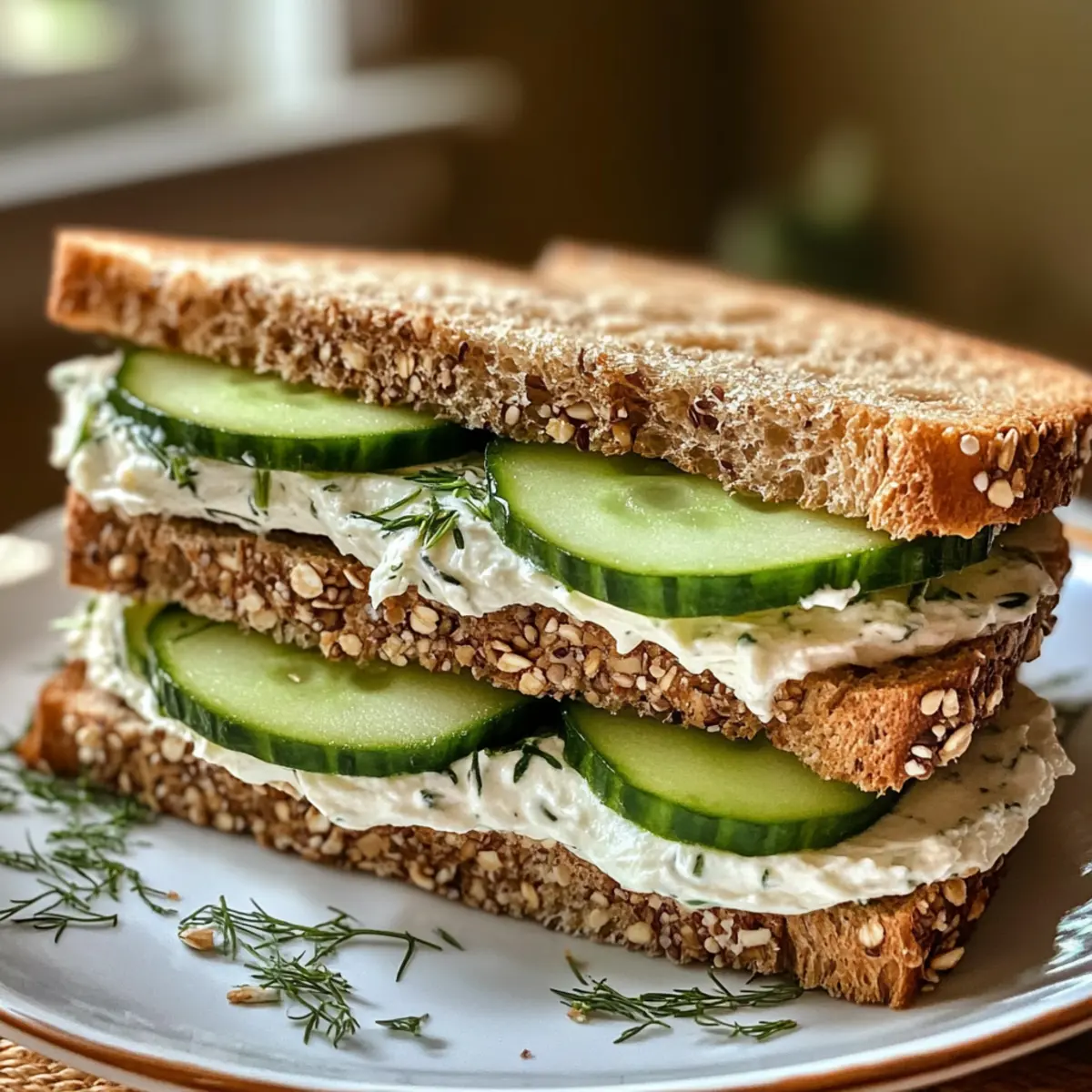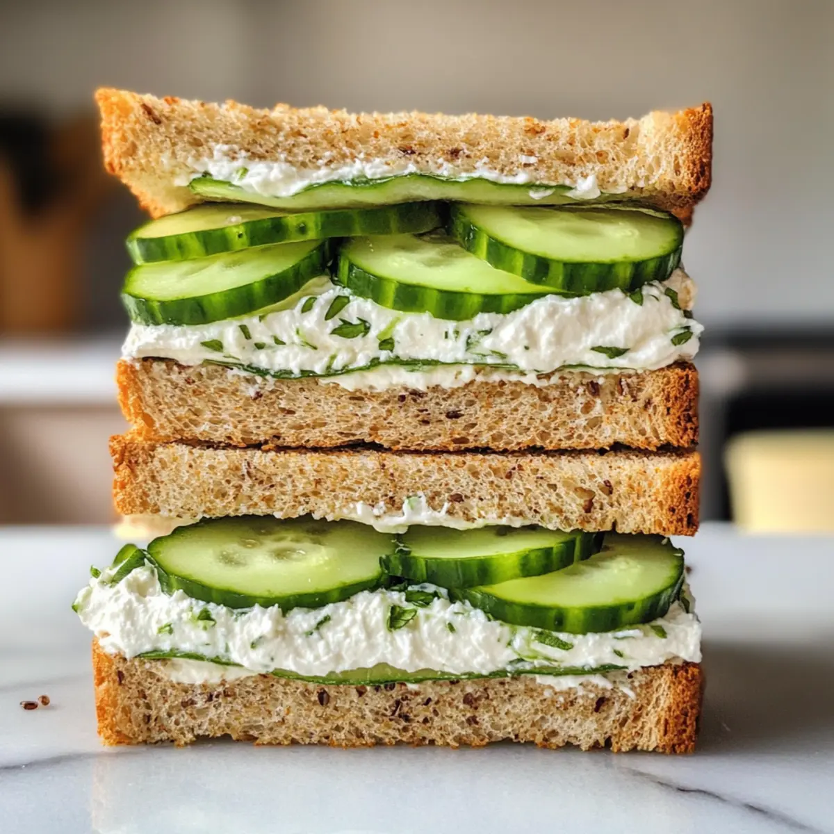 - Top with the remaining three slices of bread, pressing gently to seal, and add extra herb cream cheese and cucumber on top.