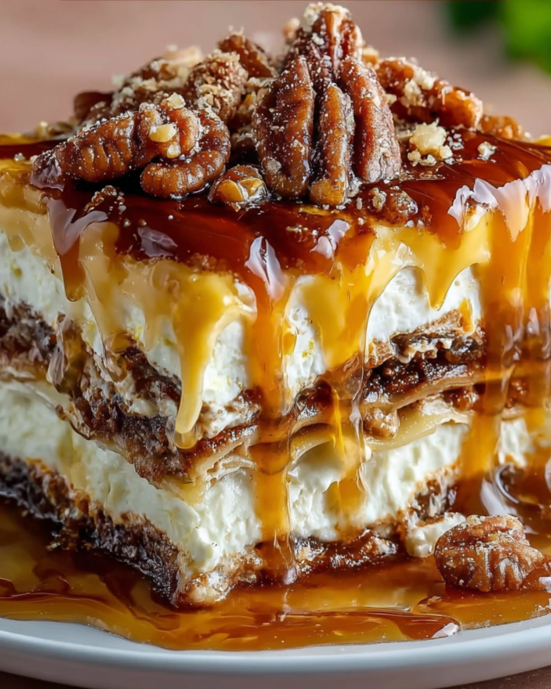 - Repeat the layering process with the remaining ricotta mixture, caramel sauce, chopped pecans, and whipped topping.