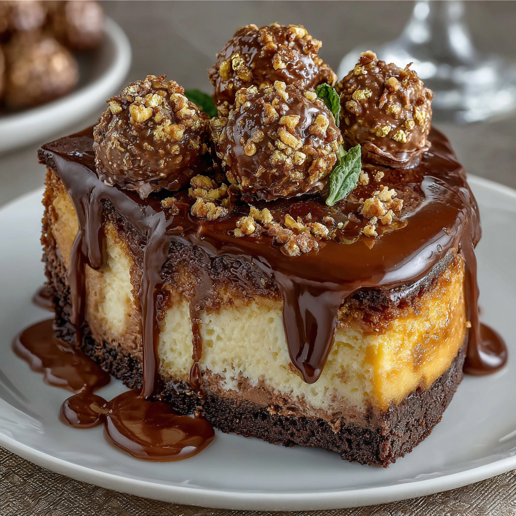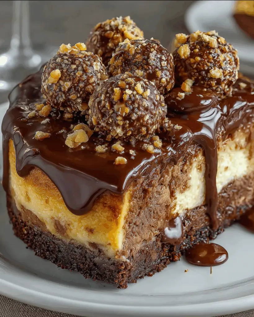 A rich and indulgent Ferrero Rocher cheesecake that combines the flavors of chocolate and hazelnut for a decadent dessert experience.