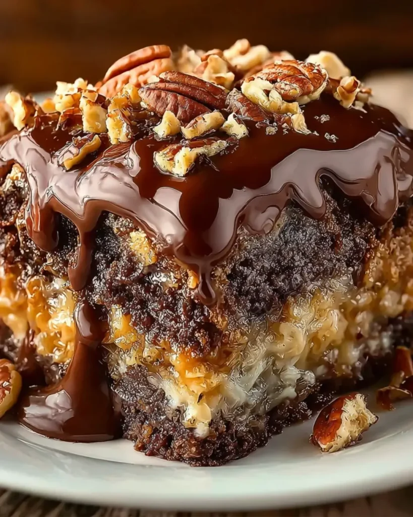 A rich and indulgent German chocolate poke cake that is sure to impress with its layers of chocolate, coconut, and pecans.
