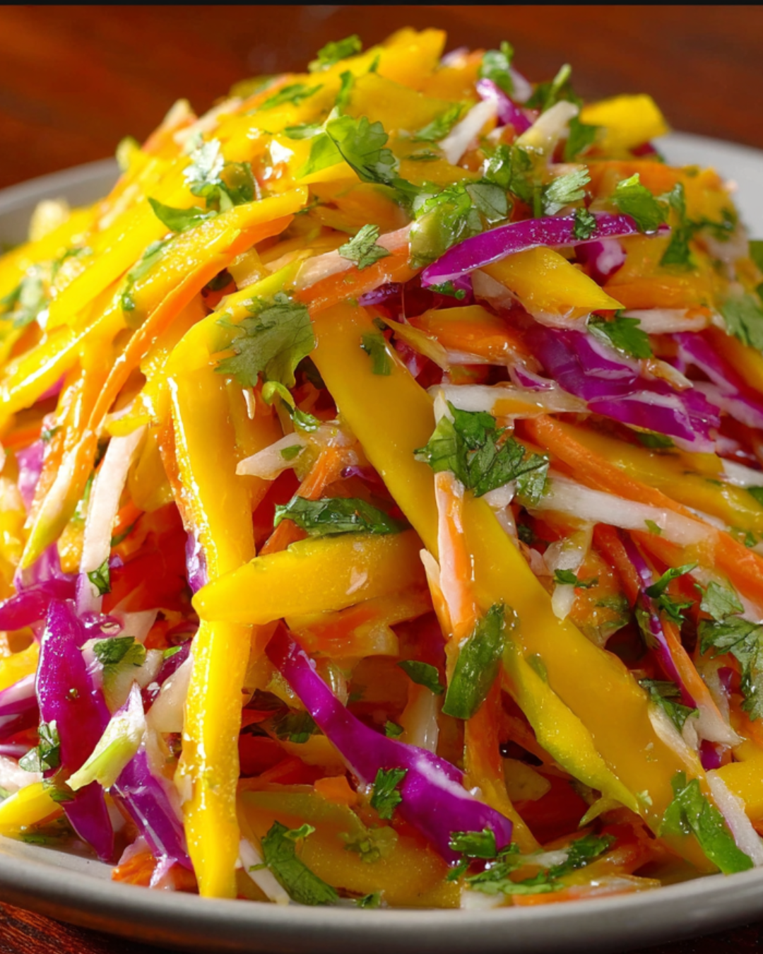 A refreshing and colorful mango slaw that combines crunchy vegetables with a sweet and tangy dressing.