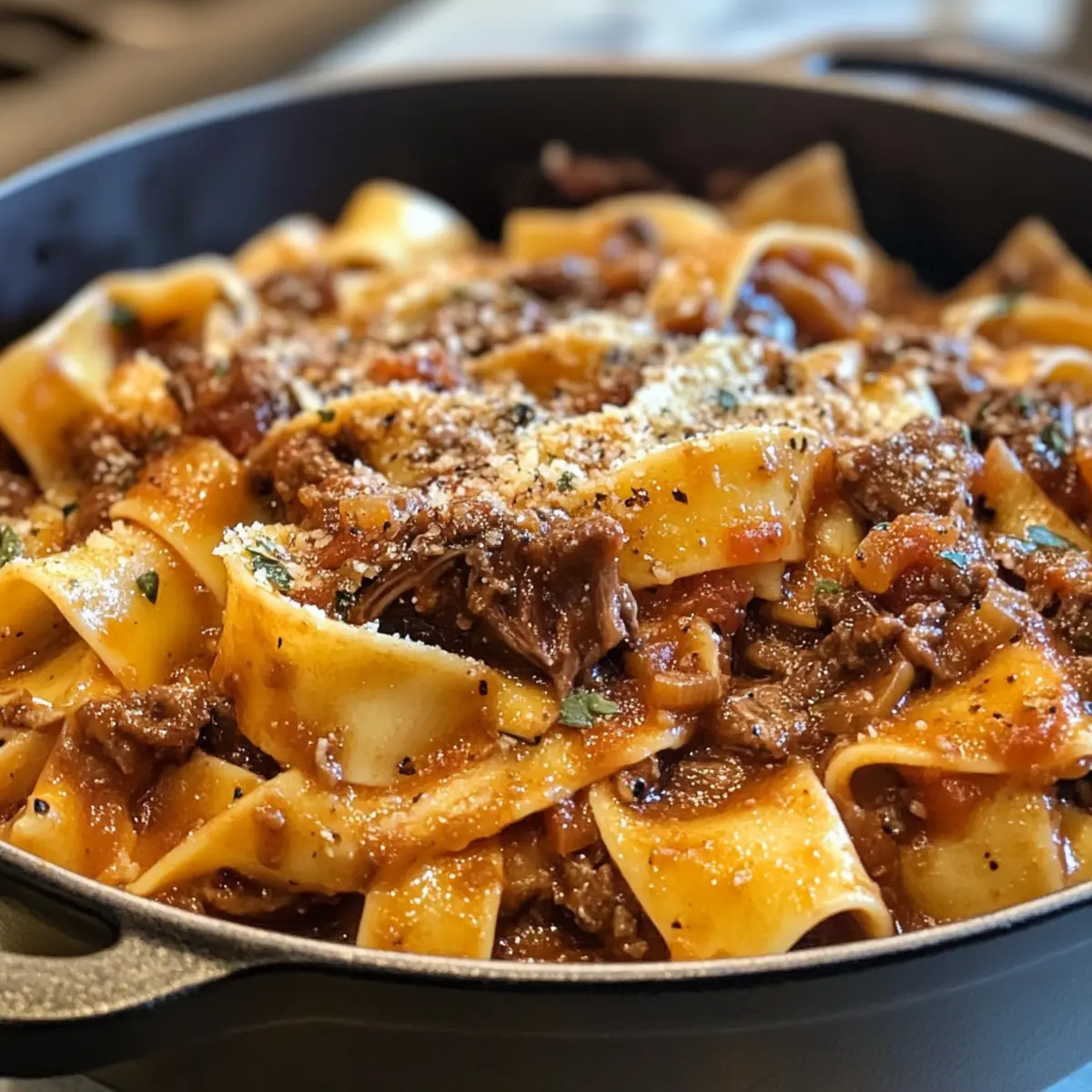 These Dutch Oven Short Rib Ragu with Pappardelle are perfect for meal prep enthusiasts! You can prepare the ragu base (steps 1 through 5) up to 3 days in advance. Simply cool the ragu completely, then transfer it to an airtight container and refrigerate. This not only saves time but also allows the flavors to deepen overnight. When you’re ready to serve, reheat the ragu gently on the stove. Boil the pappardelle fresh (step 6) just before serving, ensuring that the pasta maintains its delightful texture. If you wish to freeze the ragu, it can last up to 3 months; thaw overnight in the fridge before reheating. Enjoy a hassle-free dinner that tastes just as delicious as when freshly made!