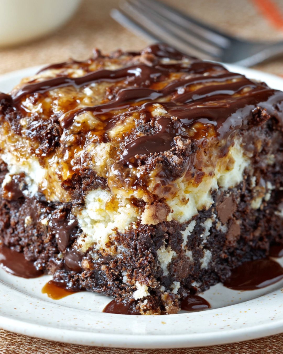 Earthquake Cake is a decadent dessert that features a rich chocolate cake base topped with a creamy swirl of cream cheese, shredded coconut, and nuts, creating a delightful marbled effect.