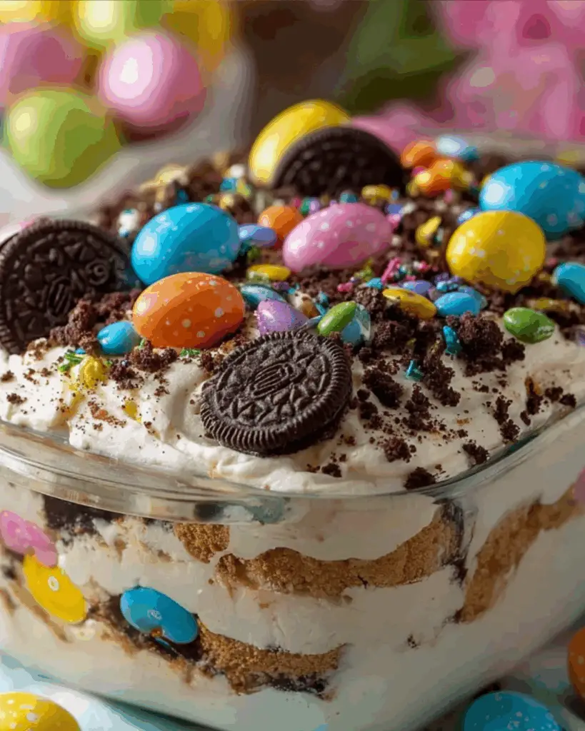 Easter Dirt Cake Casserole is a delightful and fun dessert perfect for celebrating Easter. This layered dessert features a creamy filling with crushed Oreo cookies and gummy candies, making it a hit with both kids and adults.