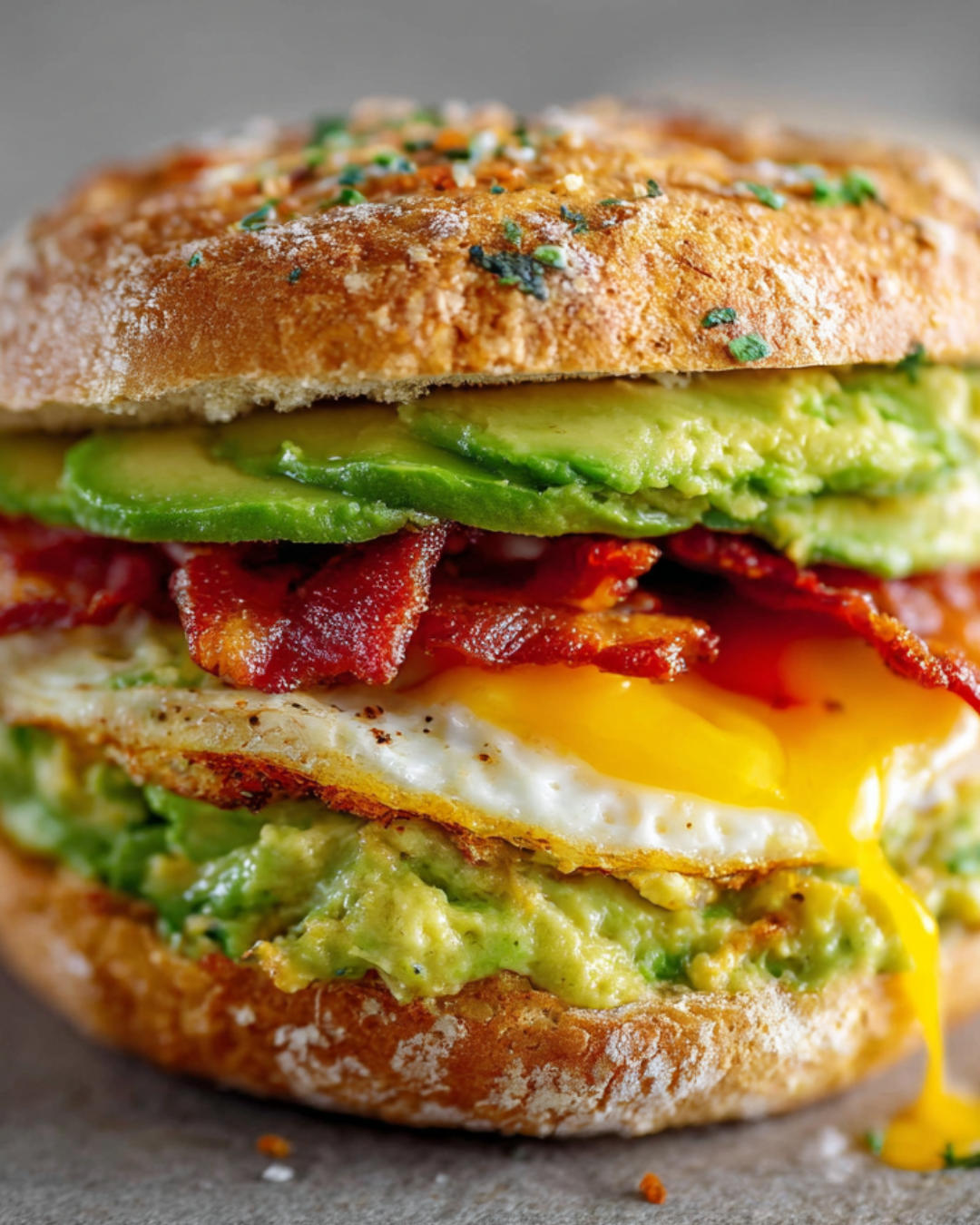 A delicious and easy-to-make breakfast sandwich featuring creamy avocado, crispy bacon, and perfectly cooked eggs.