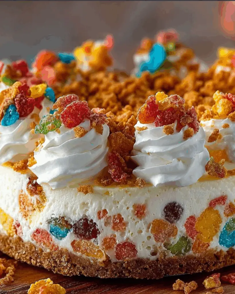 A delightful twist on a classic dessert, this Easy Fruity Pebbles Cheesecake combines the creamy richness of cheesecake with the fun and colorful crunch of Fruity Pebbles cereal.