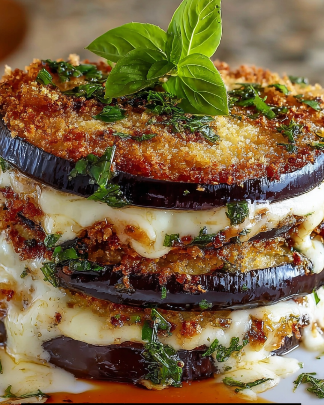 Eggplant Napoleon is a delicious layered dish made with breaded and fried eggplant slices, marinara sauce, ricotta, mozzarella, and Parmesan cheese, garnished with fresh basil.
