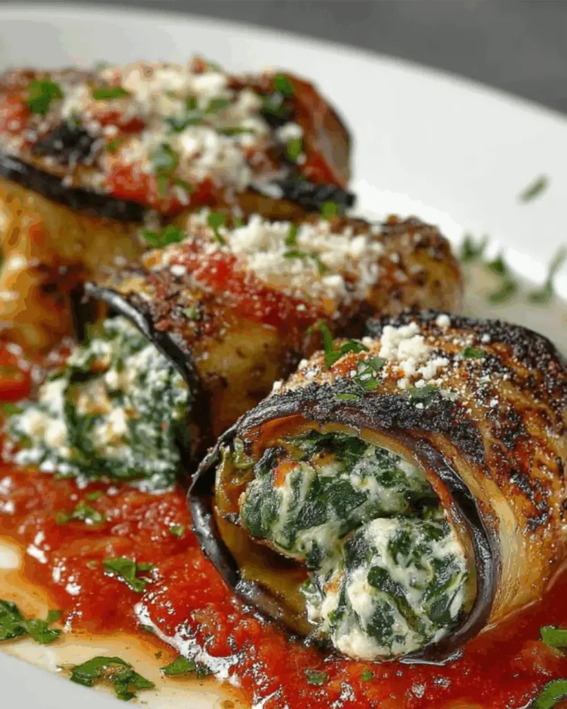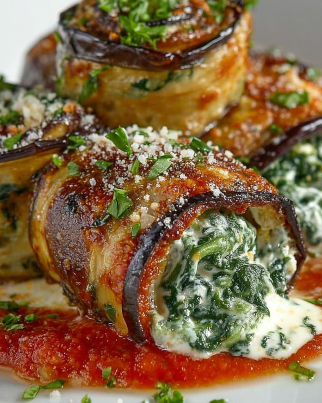 Delicious eggplant roll-ups filled with a creamy spinach and cheese mixture, baked to perfection.