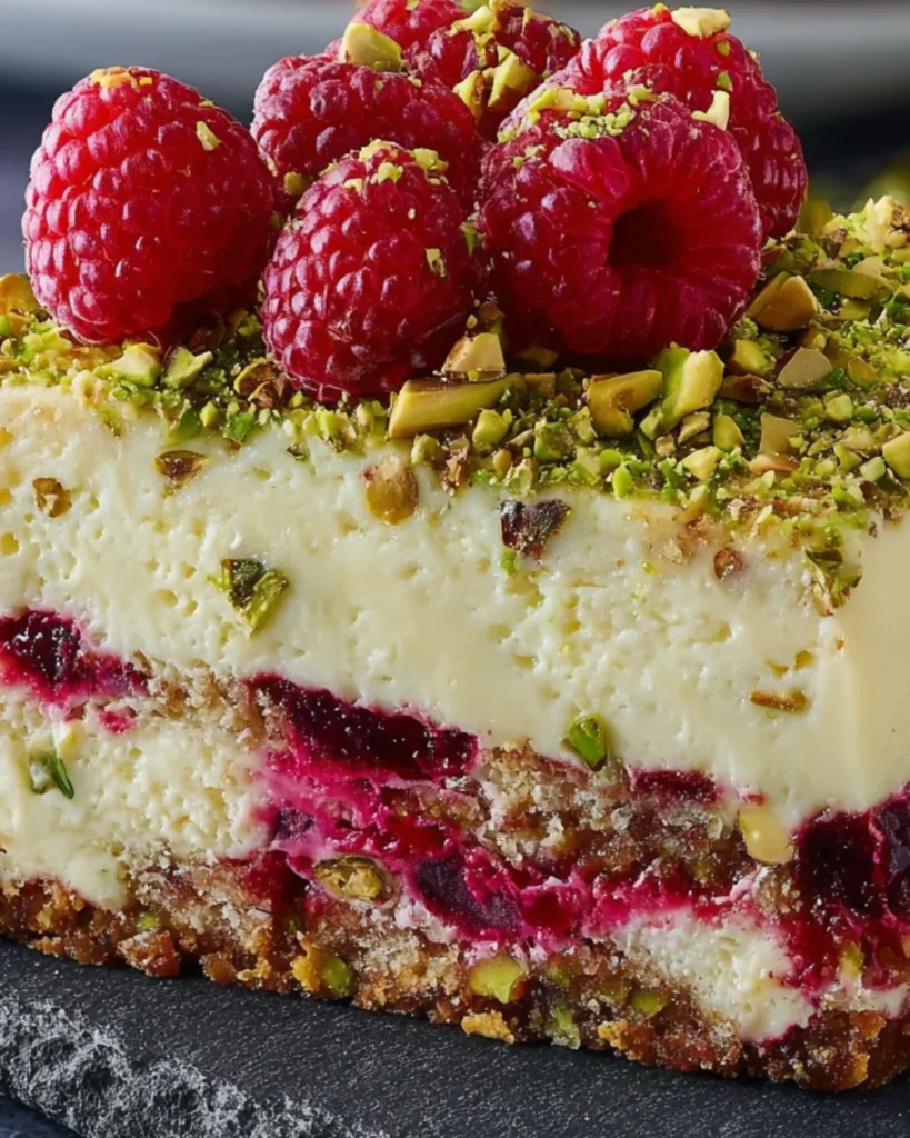 Each slice tells a story, from the crunchy pistachio crust to the vibrant raspberry swirls.
