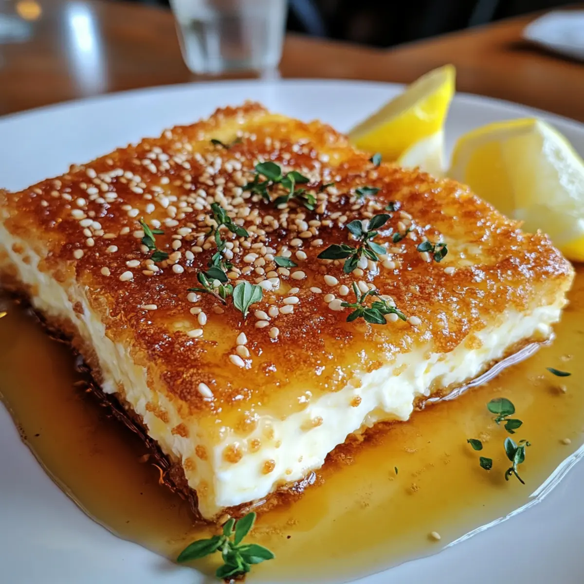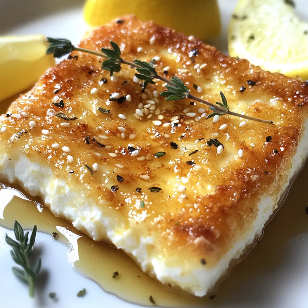 Once the feta saganaki is perfectly golden and crispy on both sides, remove it from the skillet and place it on a serving dish. Drizzle with honey for a touch of sweetness, then garnish with fresh thyme leaves and sesame seeds. Serve immediately alongside lemon wedges to squeeze over for an extra burst of flavor.