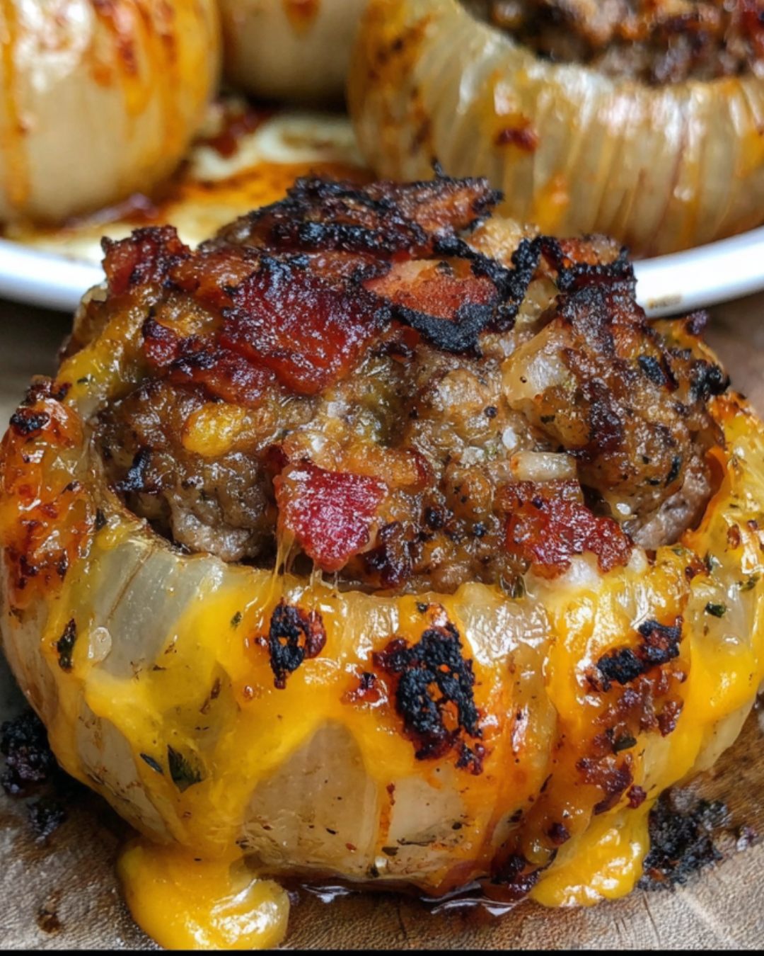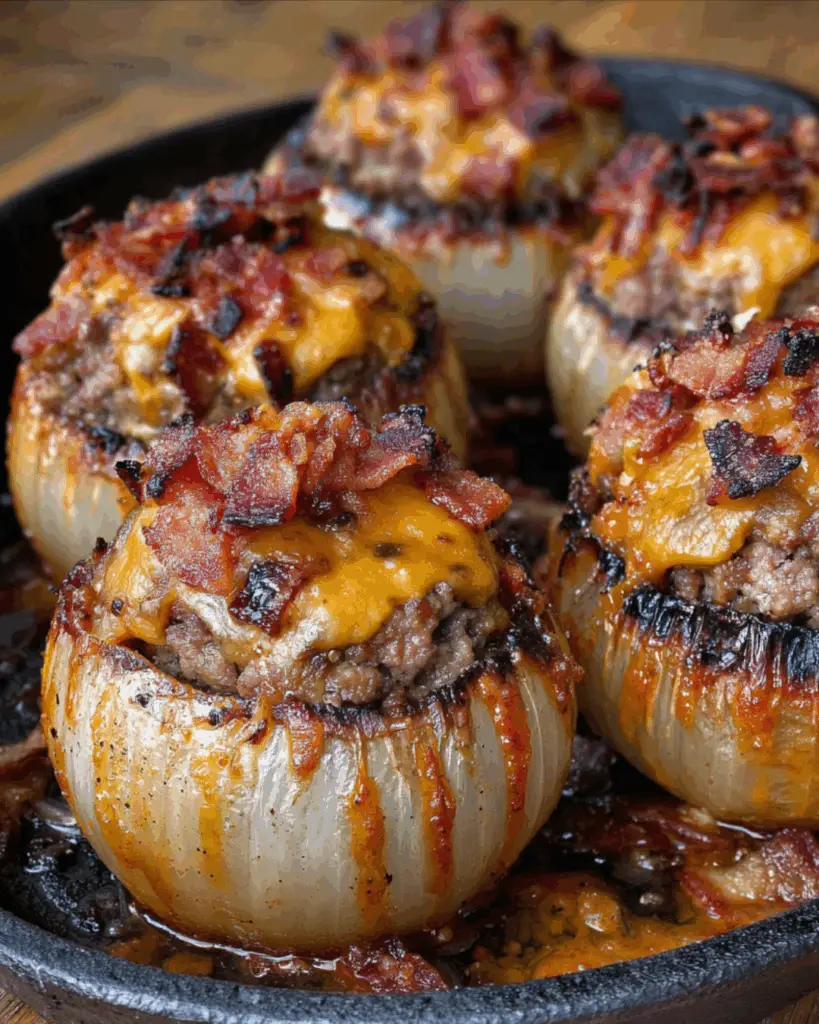 The sweet, tender onions cradle a savory filling of beef, bacon, and cheese, creating a burst of flavor in every bite.