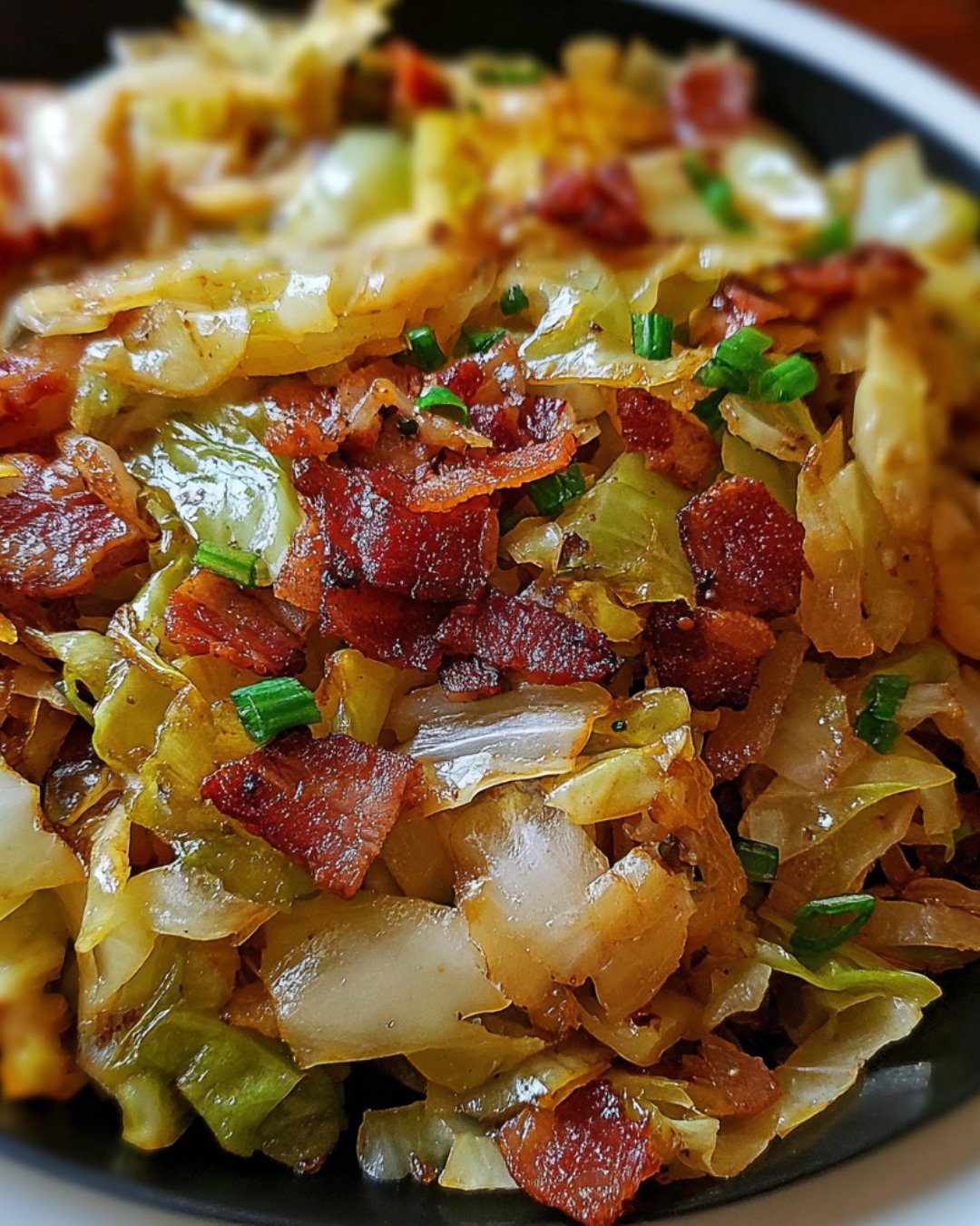 A delicious and savory dish made with fried cabbage, crispy bacon, onions, and garlic, perfect as a side or main course.
